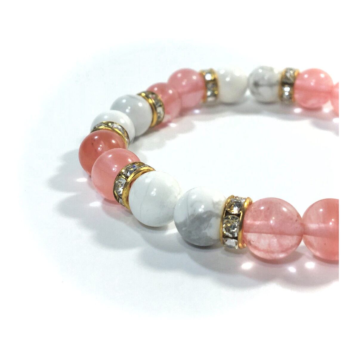 こちらは、8mm玉のハウライトとチェリークォーツを使ったパワーストーンブレスレットです。シンプルなデザインでどんなコーディネートにも合わせやすいデザインに仕上げています。サイズは内周約15cmです。気になる方は是非この機会にどうぞ。