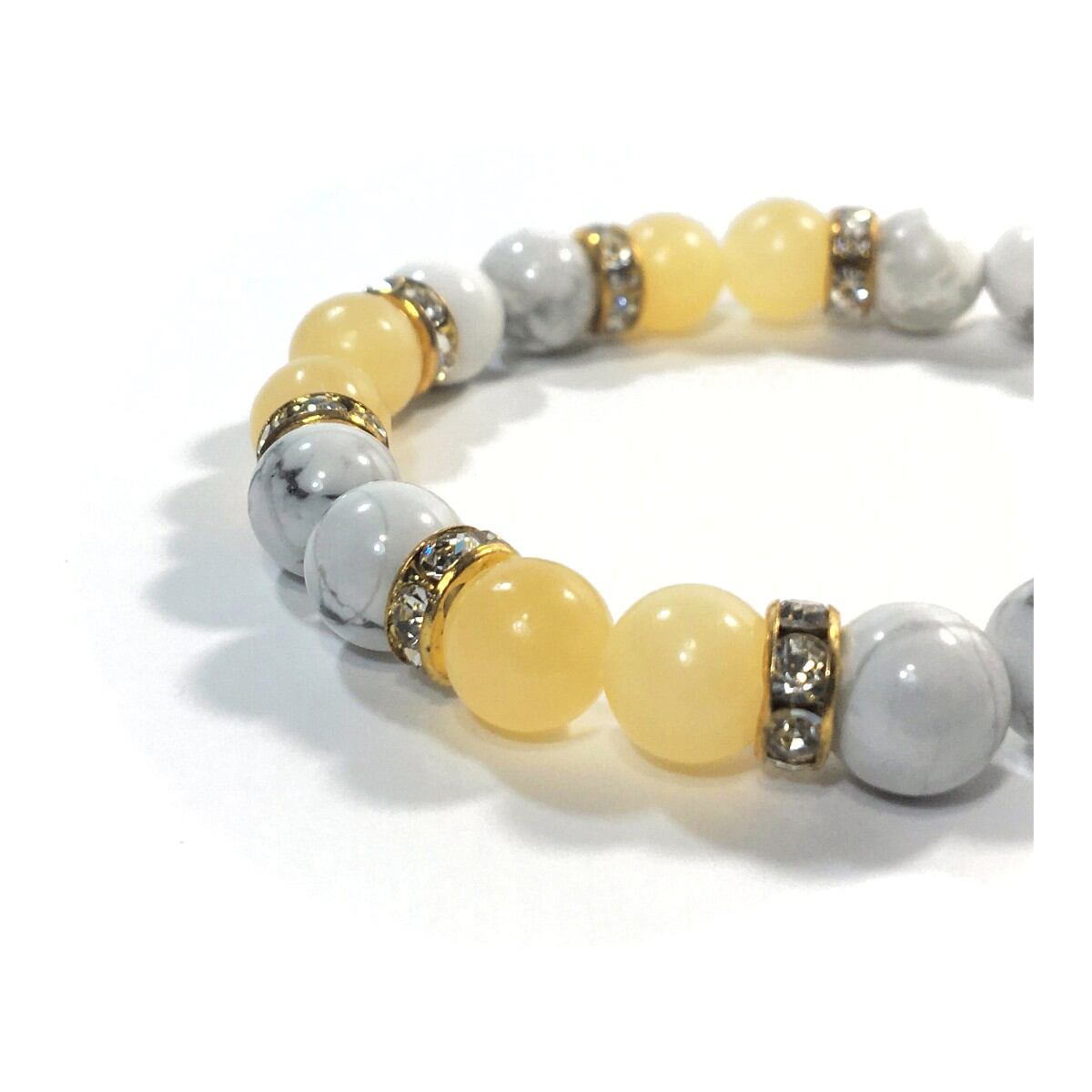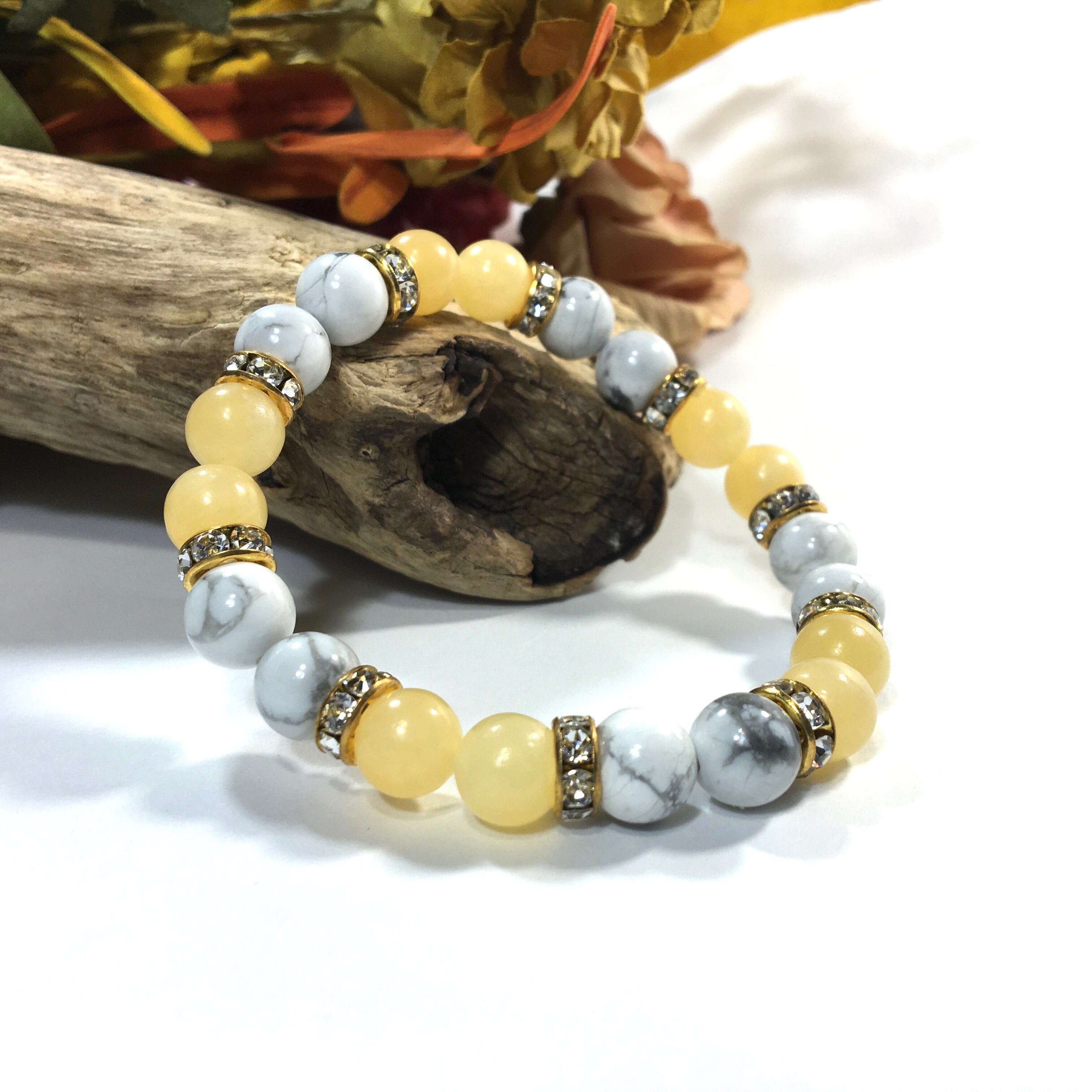 こちらは、8mm玉のハウライトとアラゴナイトを使ったパワーストーンブレスレットです。シンプルなデザインでどんなコーディネートにも合わせやすいデザインに仕上げています。サイズは内周約15cmです。気になる方は是非この機会にどうぞ。