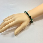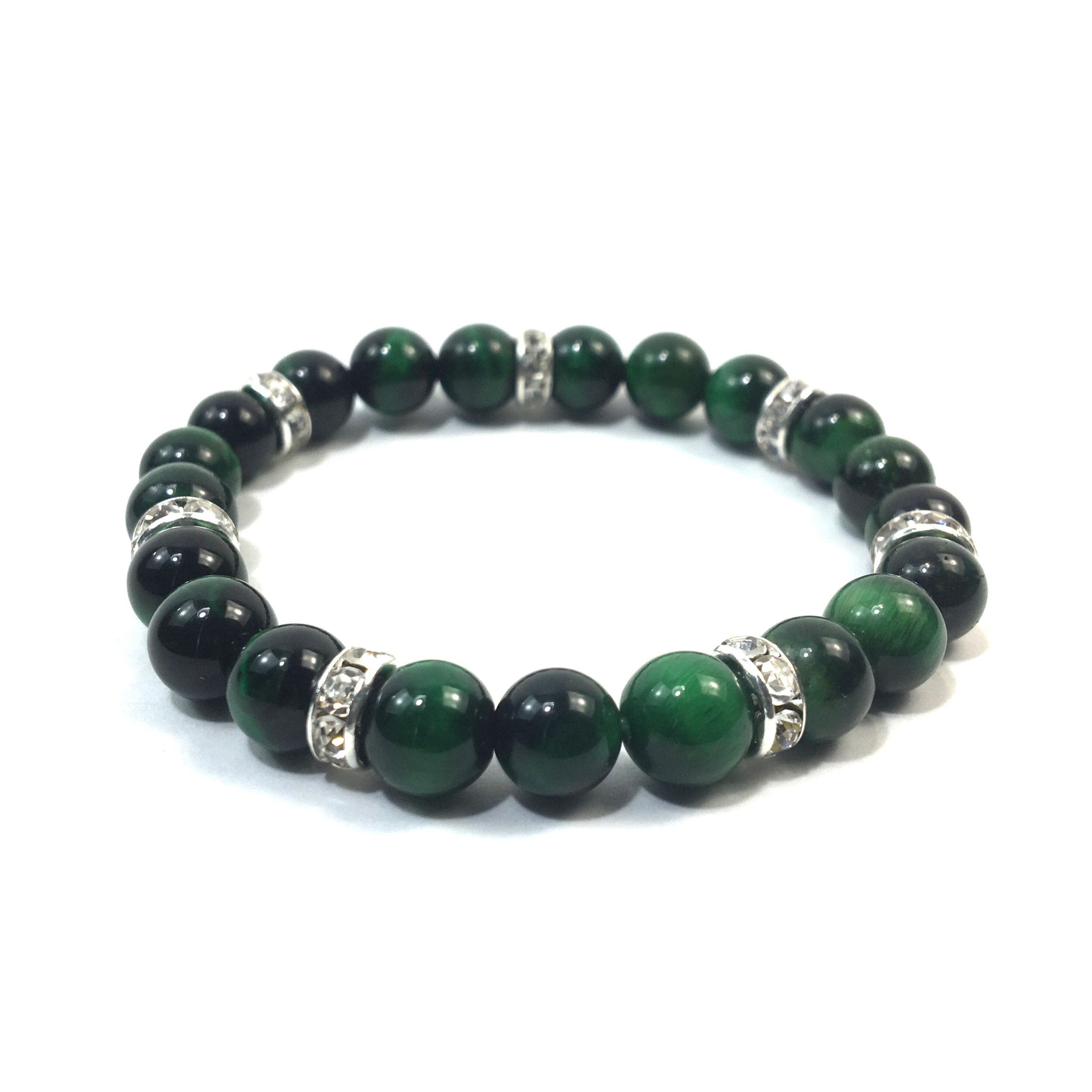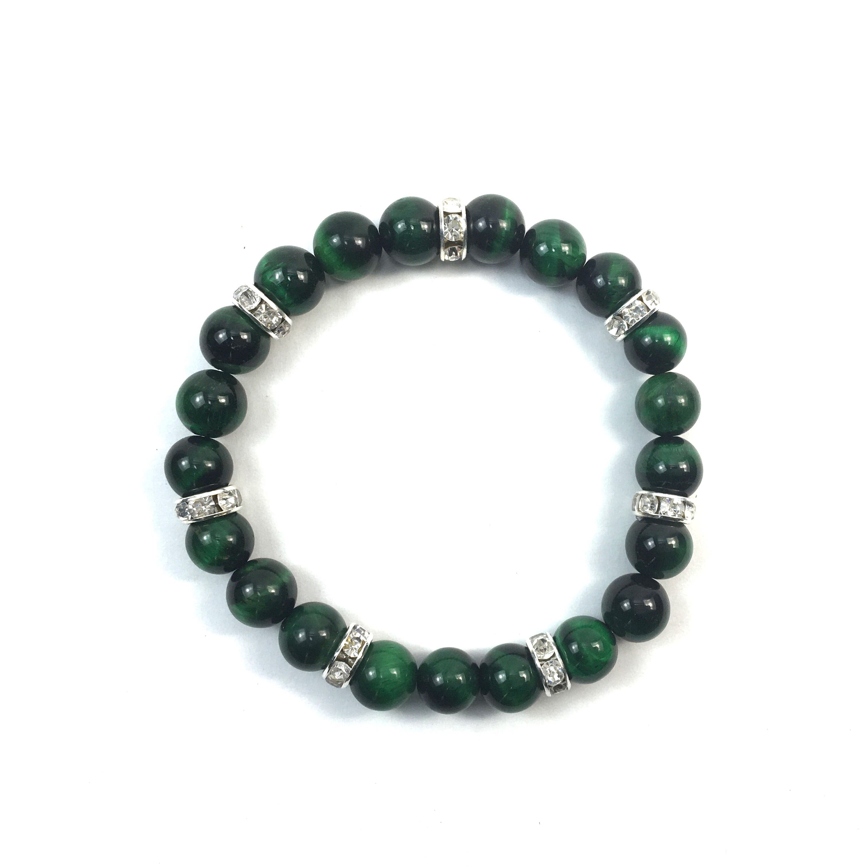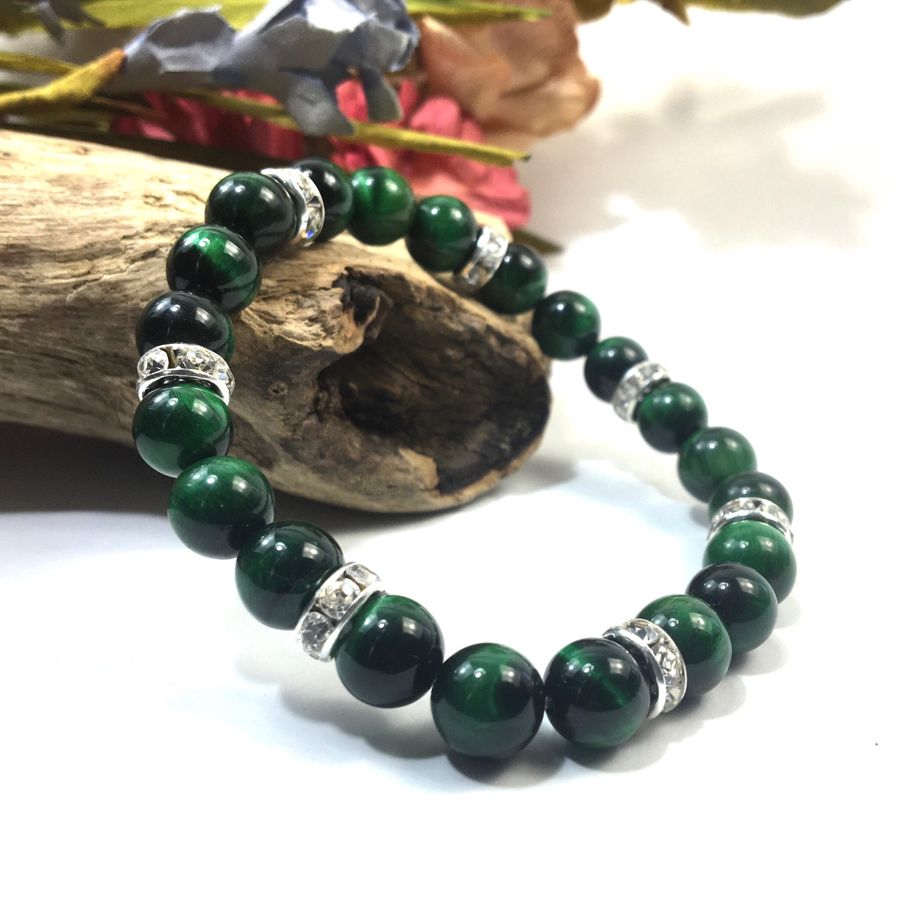 こちらは、8mm玉のグリーンタイガーアイを使ったパワーストーンブレスレットです。シンプルなデザインでどんなコーディネートにも合わせやすいデザインに仕上げています。サイズは内周約15cmです。気になる方は是非この機会にどうぞ。