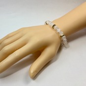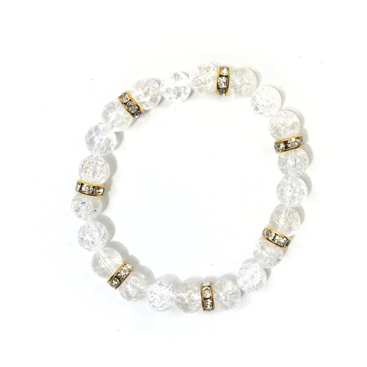 こちらは、8mm玉のクラック水晶を使ったパワーストーンブレスレットです。シンプルなデザインでどんなコーディネートにも合わせやすいデザインに仕上げています。サイズは内周約15cmです。気になる方は是非この機会にどうぞ。