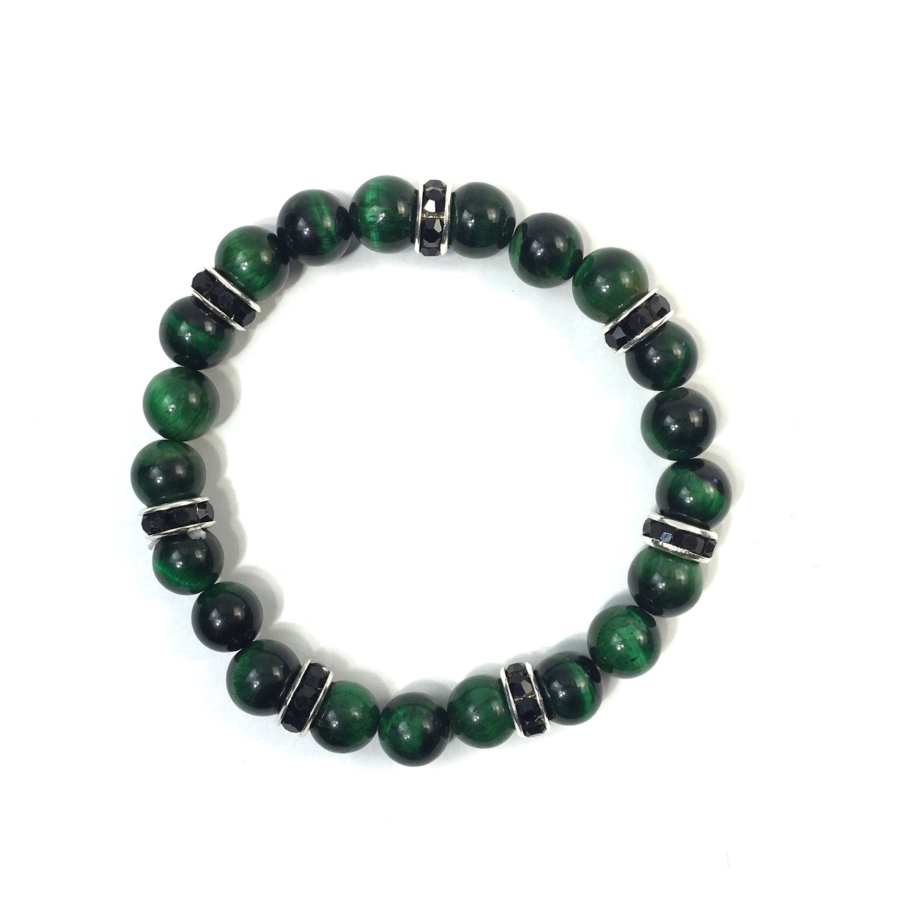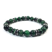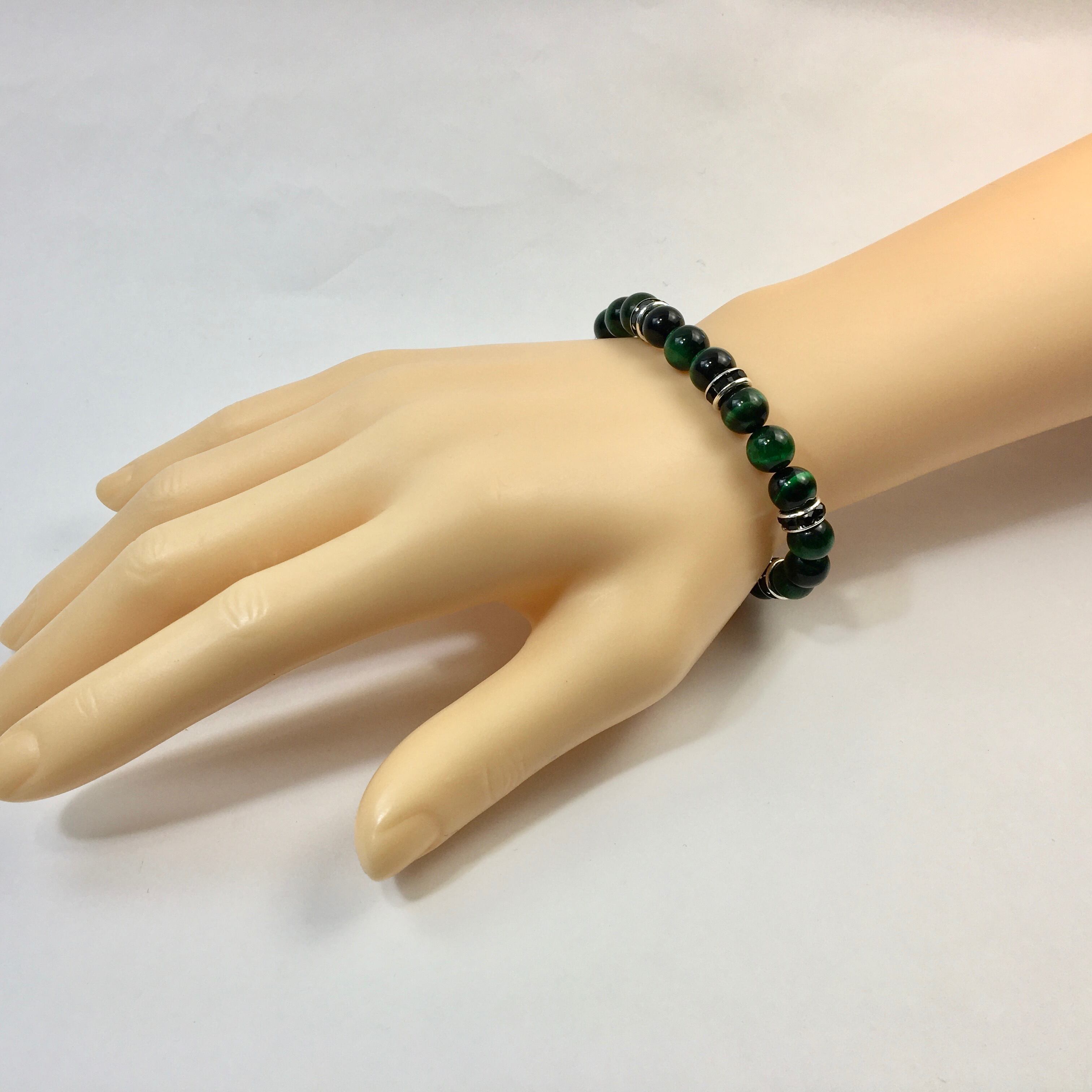 こちらは、8mm玉のグリーンタイガーアイを使ったパワーストーンブレスレットです。シンプルなデザインでどんなコーディネートにも合わせやすいデザインに仕上げています。サイズは内周約15cmです。気になる方は是非この機会にどうぞ。