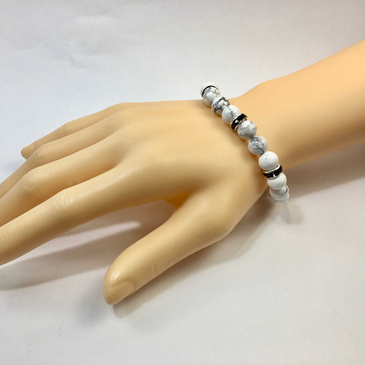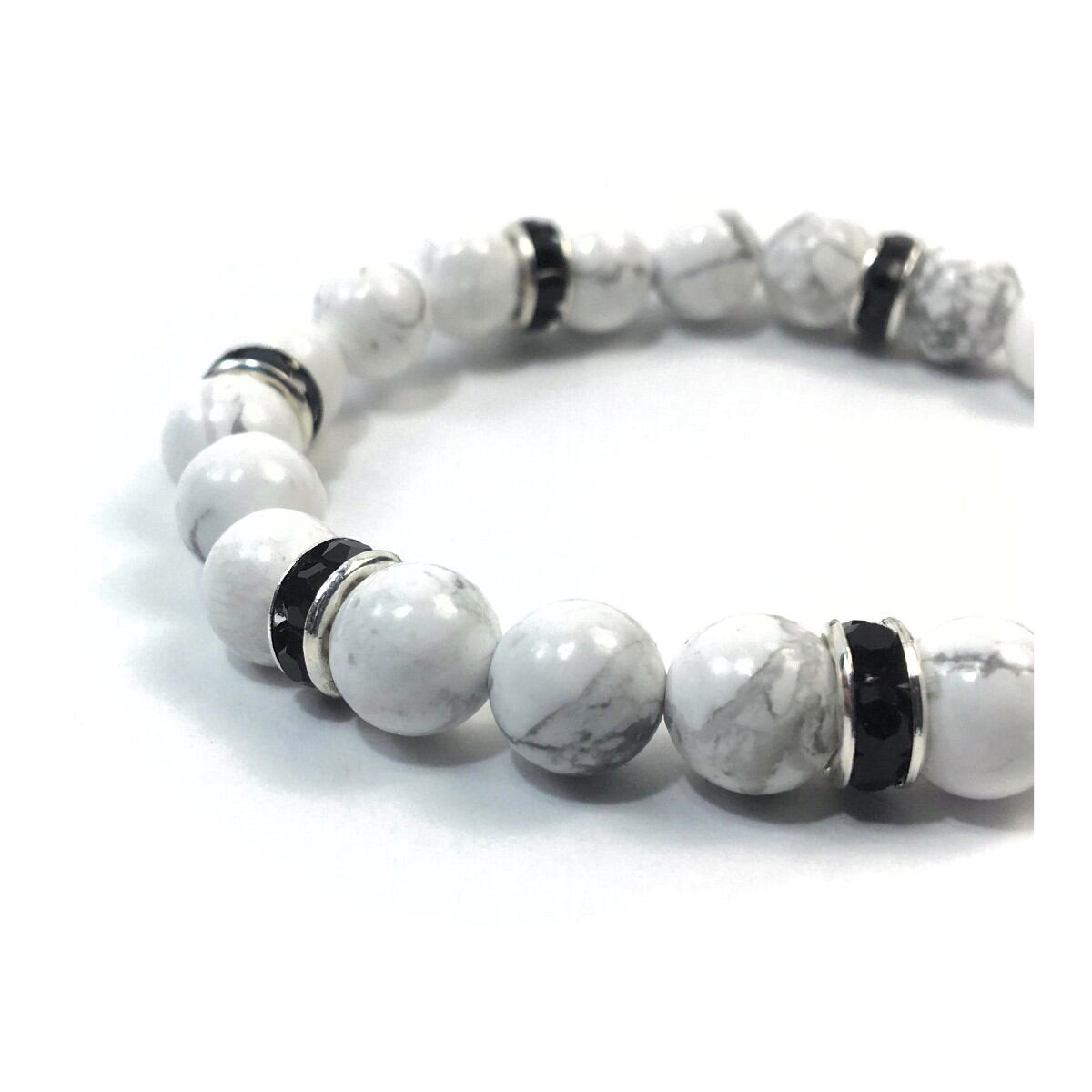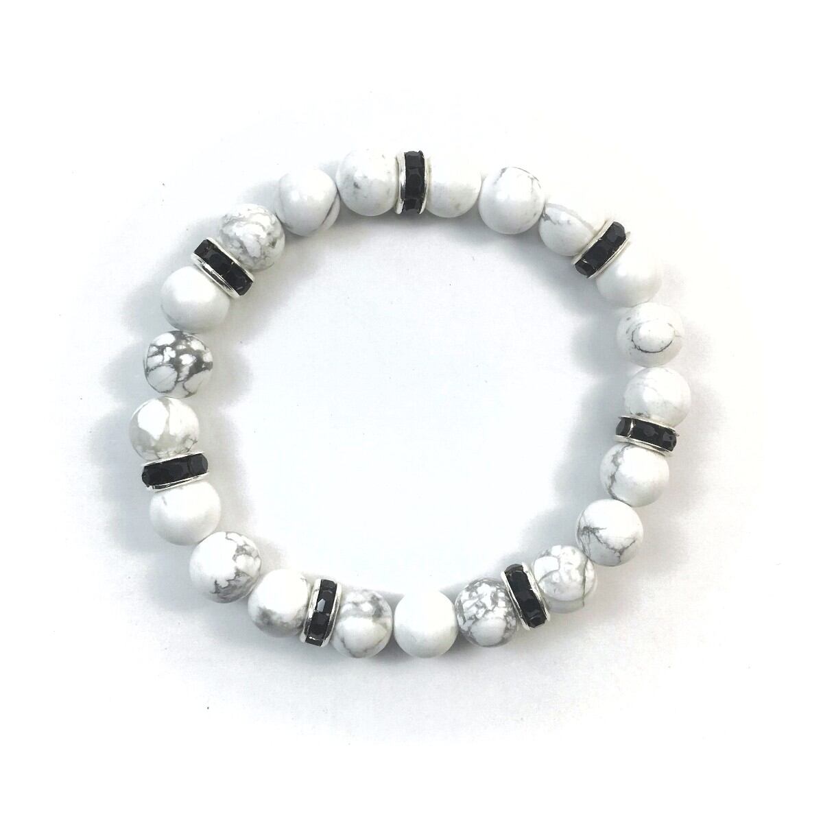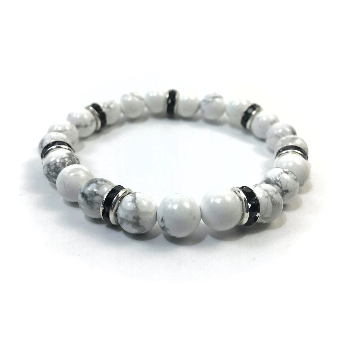 こちらは、8mm玉のハウライトを使ったパワーストーンブレスレットです。シンプルなデザインでどんなコーディネートにも合わせやすいデザインに仕上げています。サイズは内周約15cmです。気になる方は是非この機会にどうぞ。