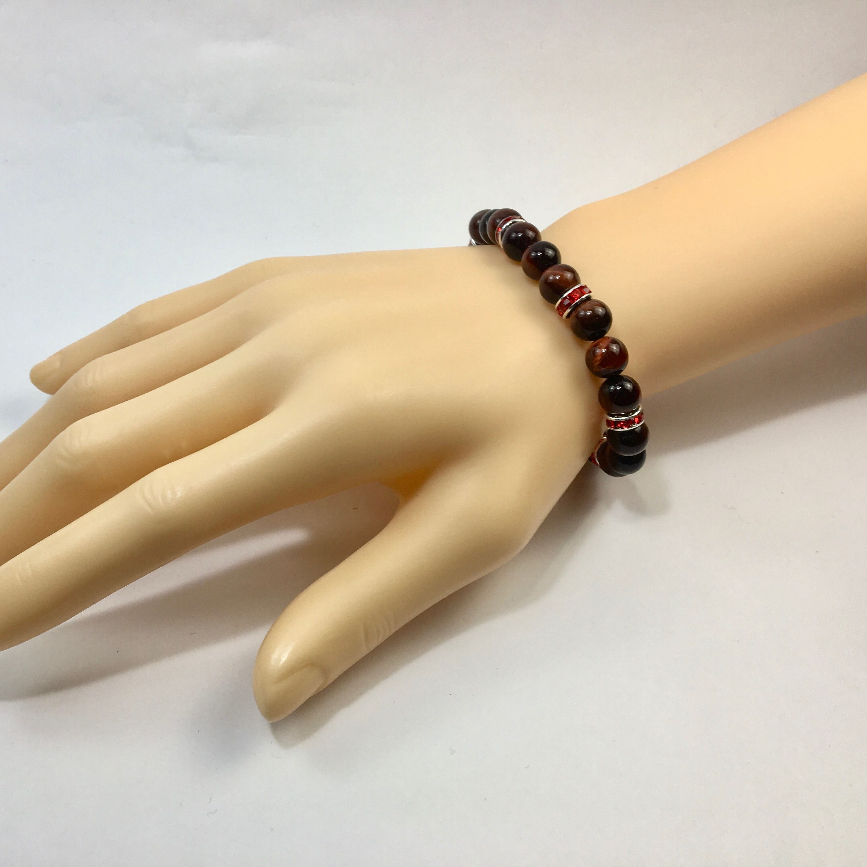 こちらは、8mm玉のレッドタイガーアイを使ったパワーストーンブレスレットです。シンプルなデザインでどんなコーディネートにも合わせやすいデザインに仕上げています。サイズは内周約15cmです。気になる方は是非この機会にどうぞ。