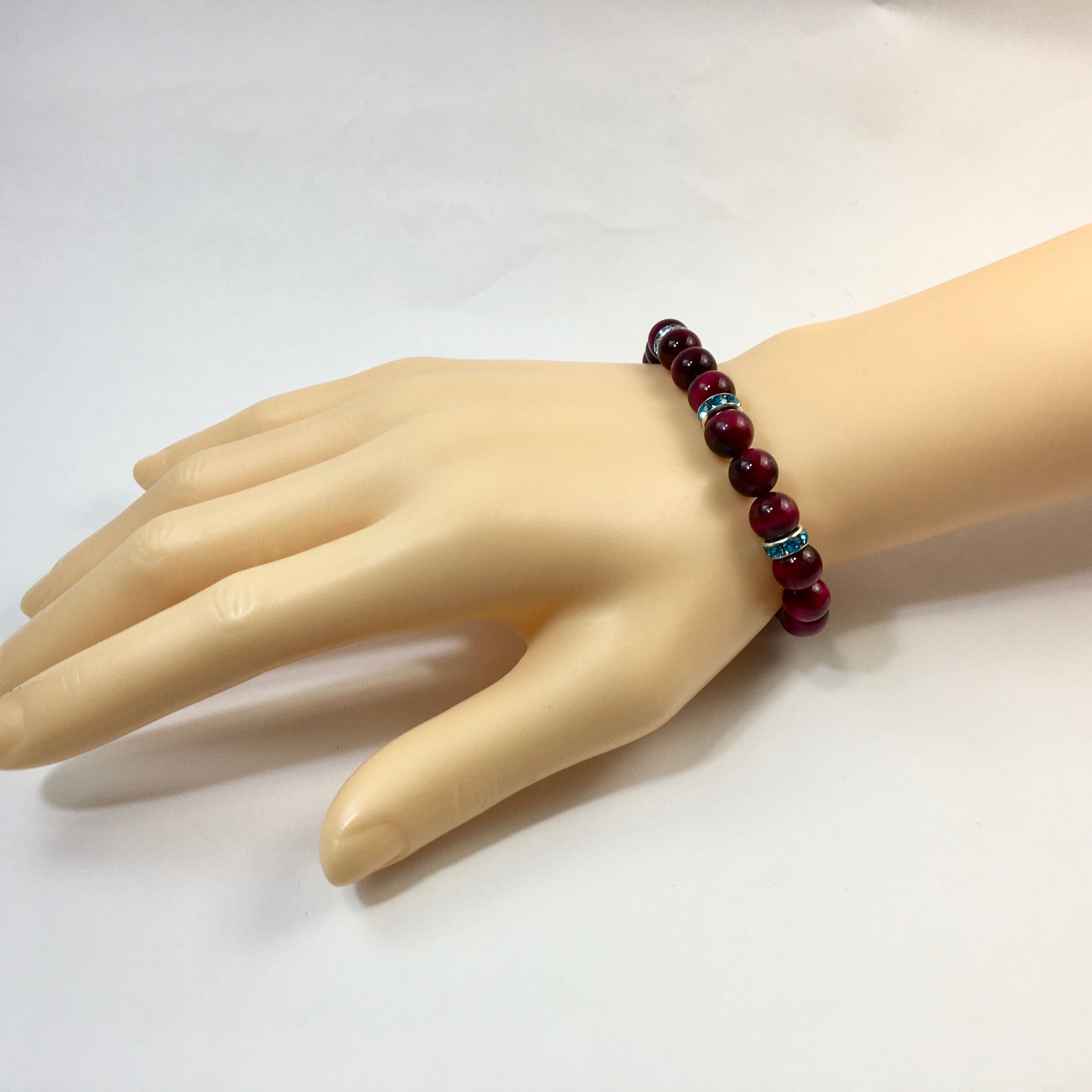 こちらは、8mm玉のピンクタイガーアイを使ったパワーストーンブレスレットです。シンプルなデザインでどんなコーディネートにも合わせやすいデザインに仕上げています。サイズは内周約15cmです。気になる方は是非この機会にどうぞ。