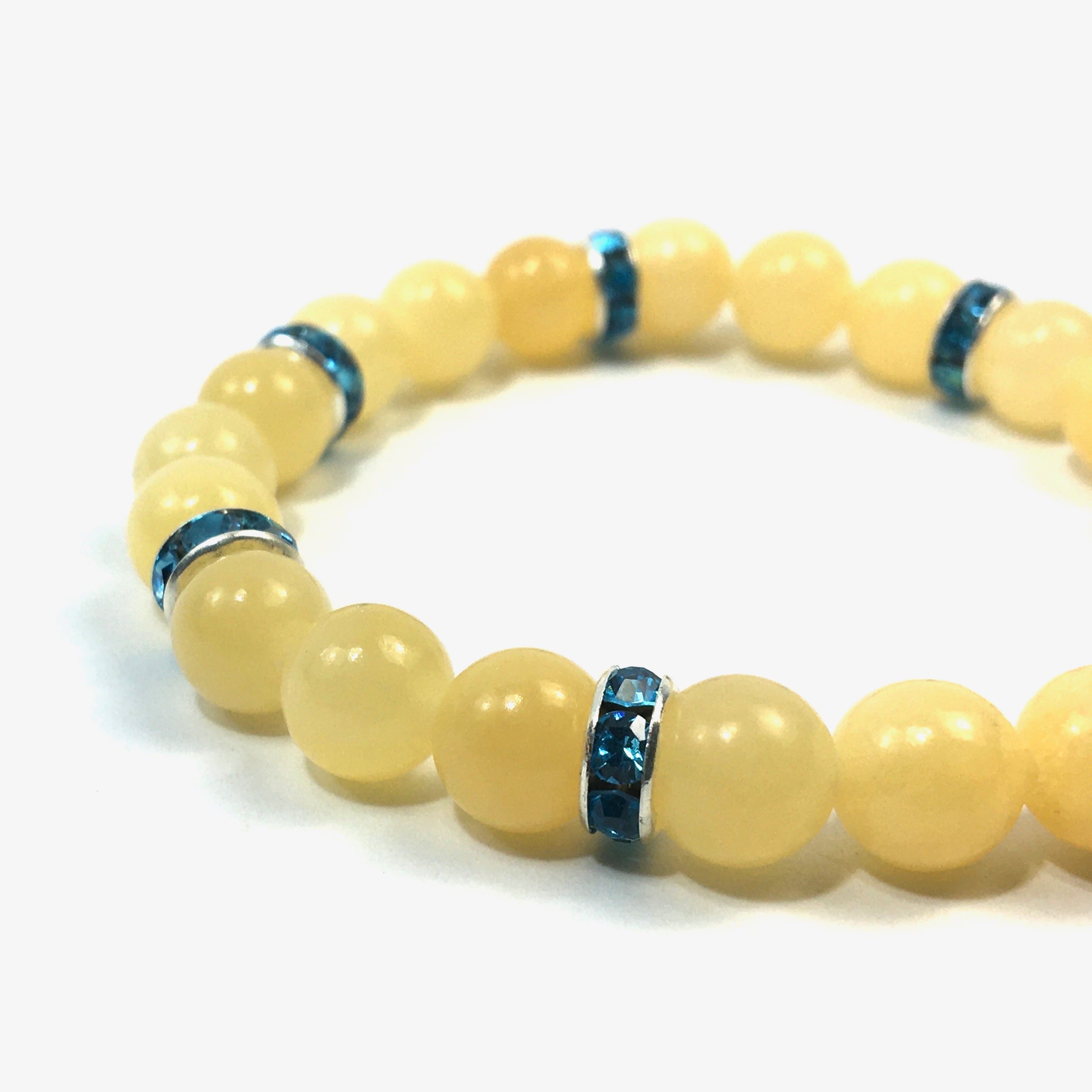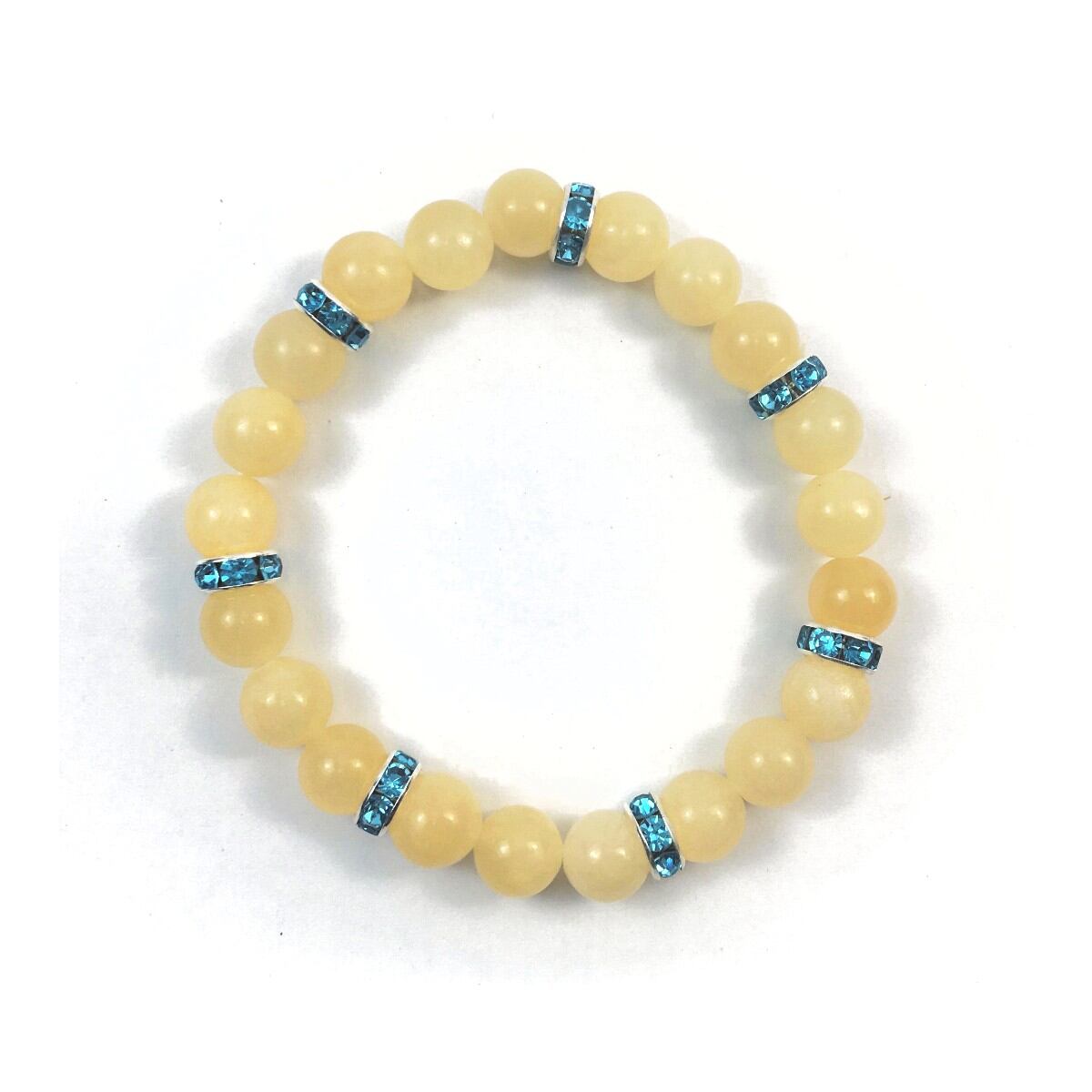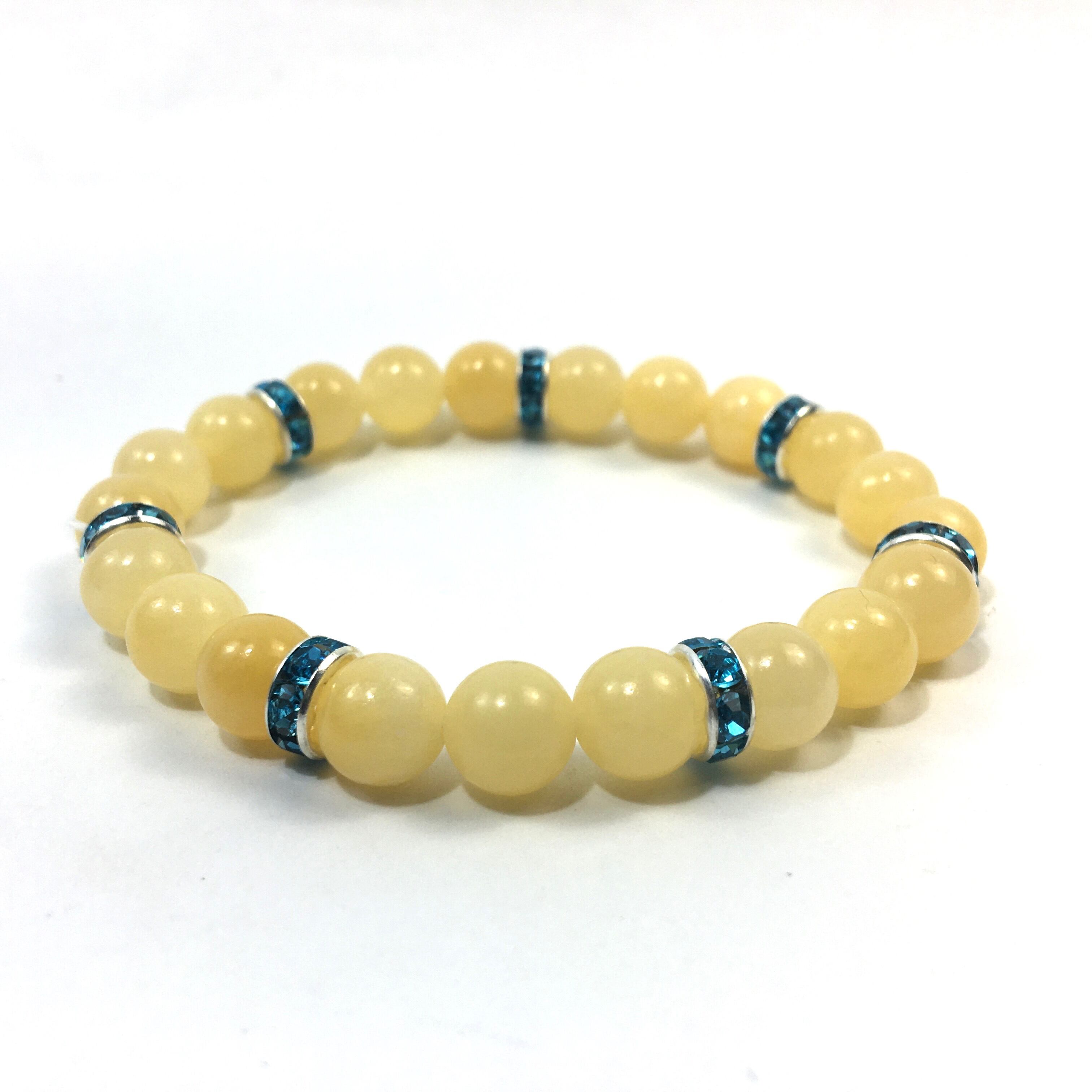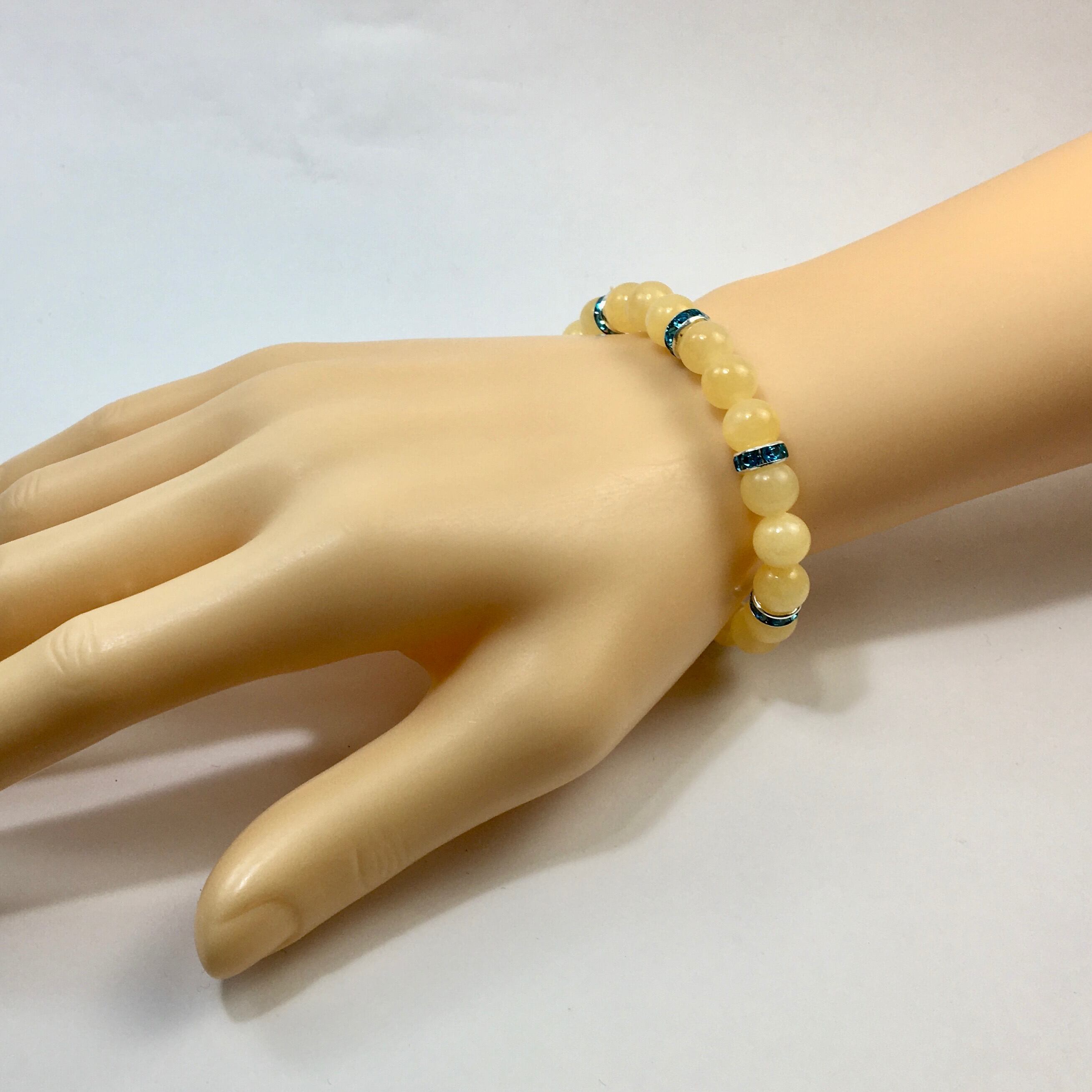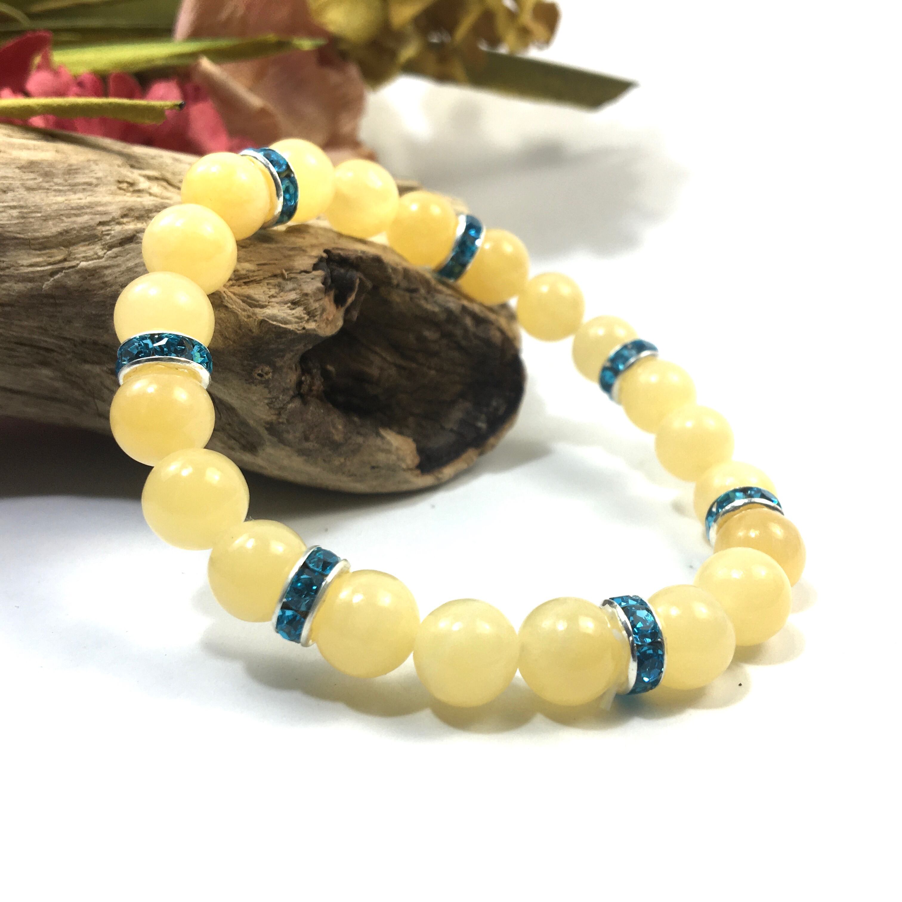 こちらは、8mm玉のアラゴナイトを使ったパワーストーンブレスレットです。シンプルなデザインでどんなコーディネートにも合わせやすいデザインに仕上げています。サイズは内周約15cmです。気になる方は是非この機会にどうぞ。