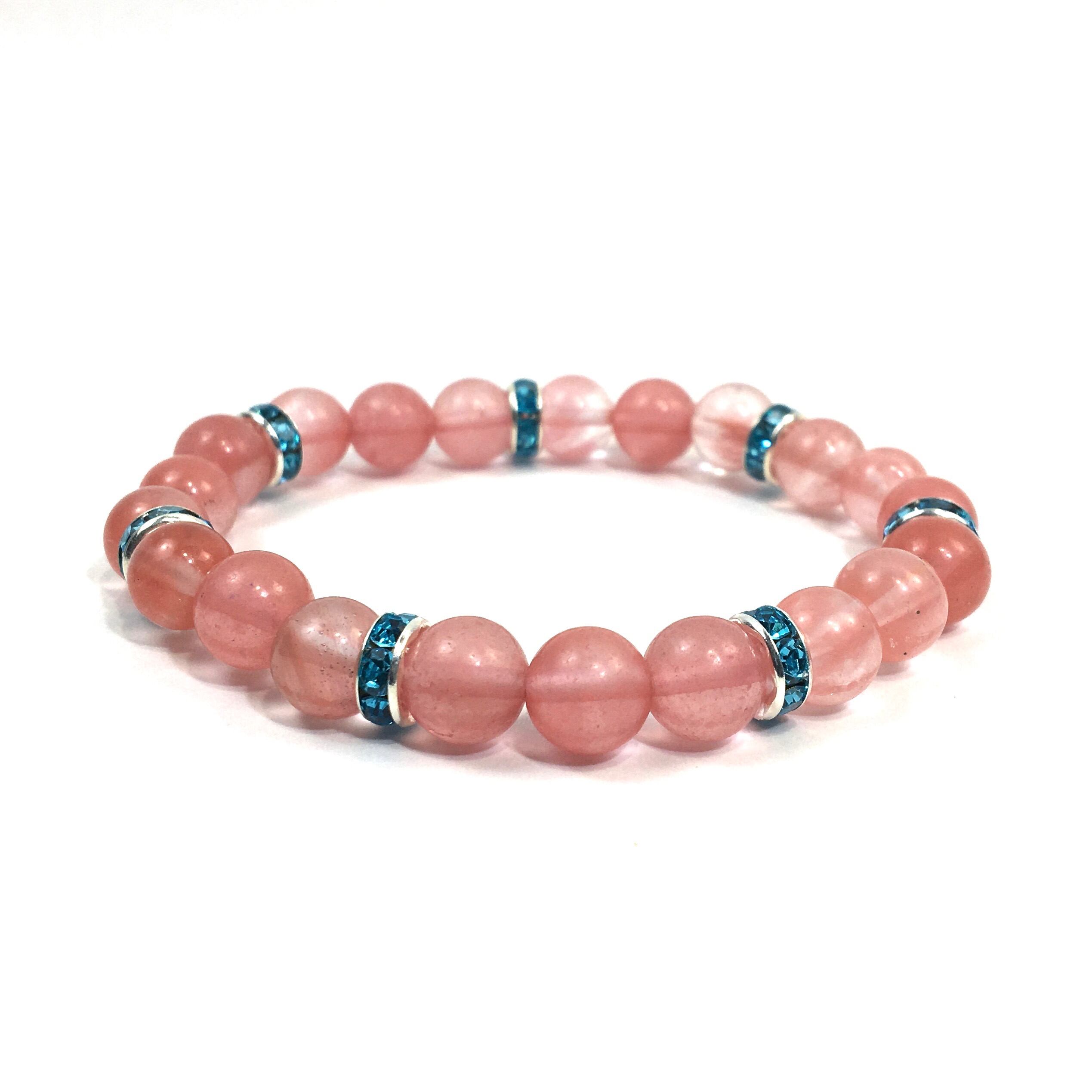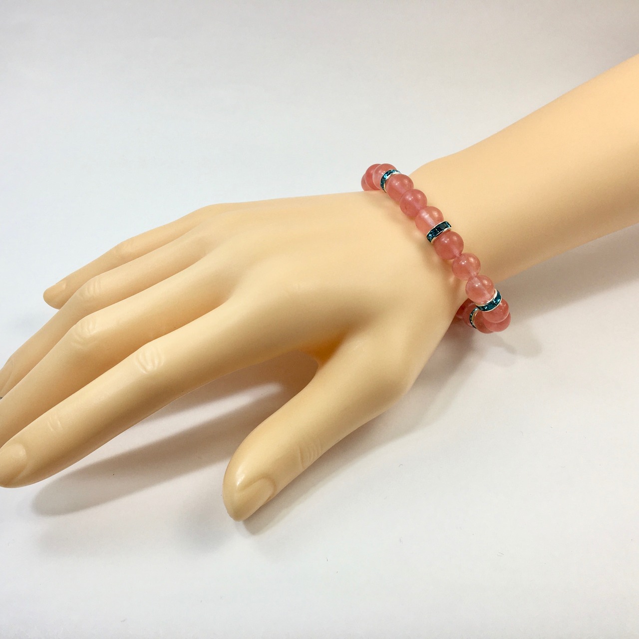こちらは、8mm玉のチェリークォーツを使ったパワーストーンブレスレットです。シンプルなデザインでどんなコーディネートにも合わせやすいデザインに仕上げています。サイズは内周約15cmです。気になる方は是非この機会にどうぞ。