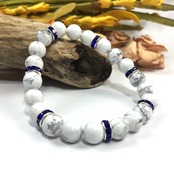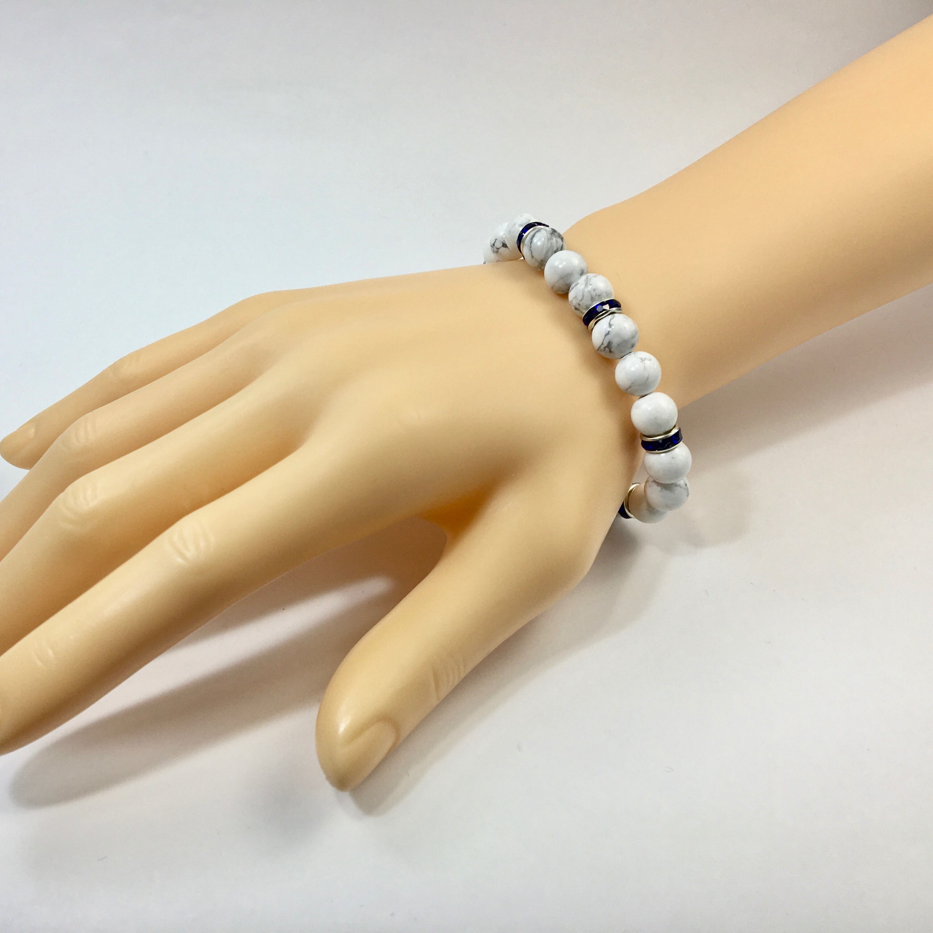 こちらは、8mm玉のハウライトを使ったパワーストーンブレスレットです。シンプルなデザインでどんなコーディネートにも合わせやすいデザインに仕上げています。サイズは内周約15cmです。気になる方は是非この機会にどうぞ。