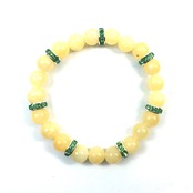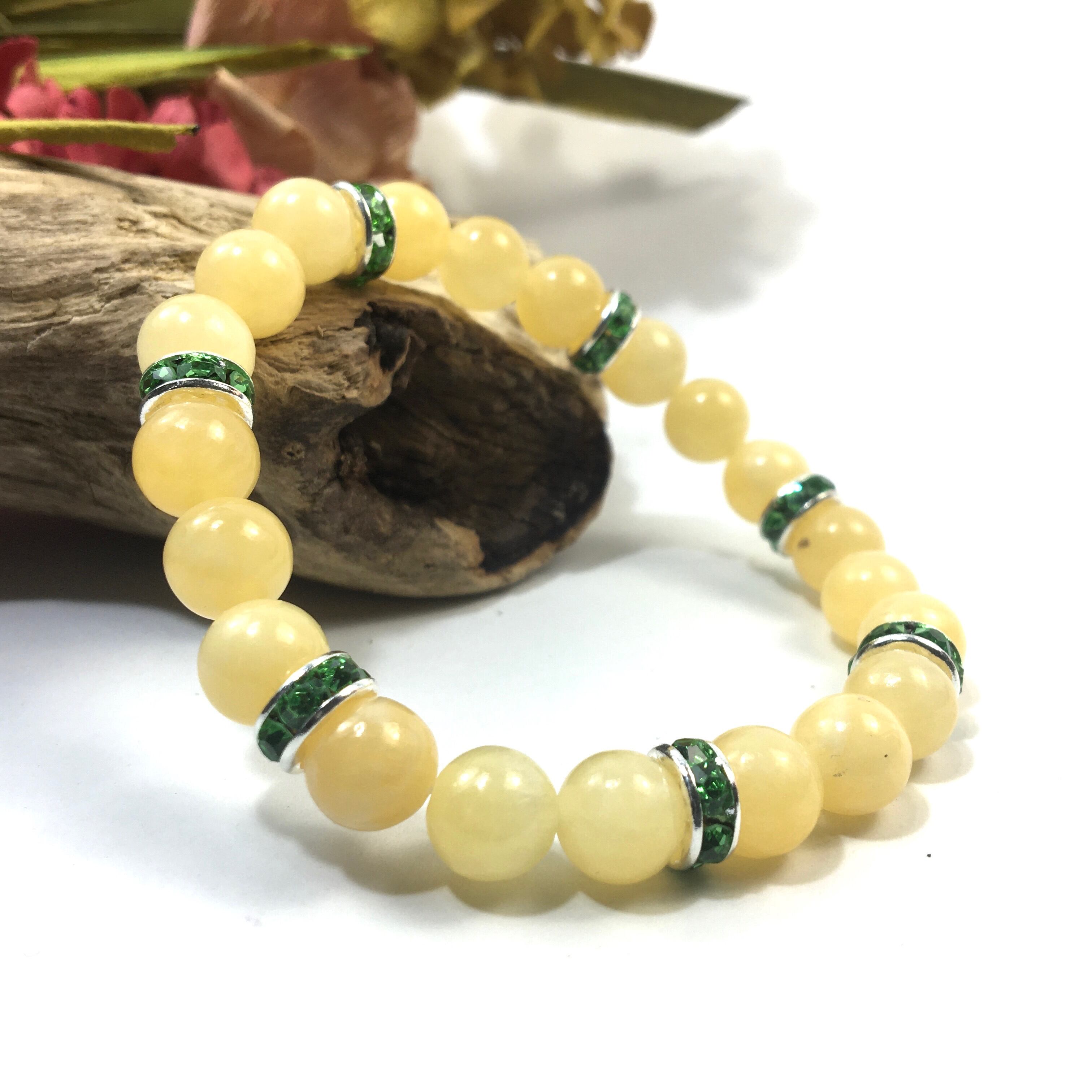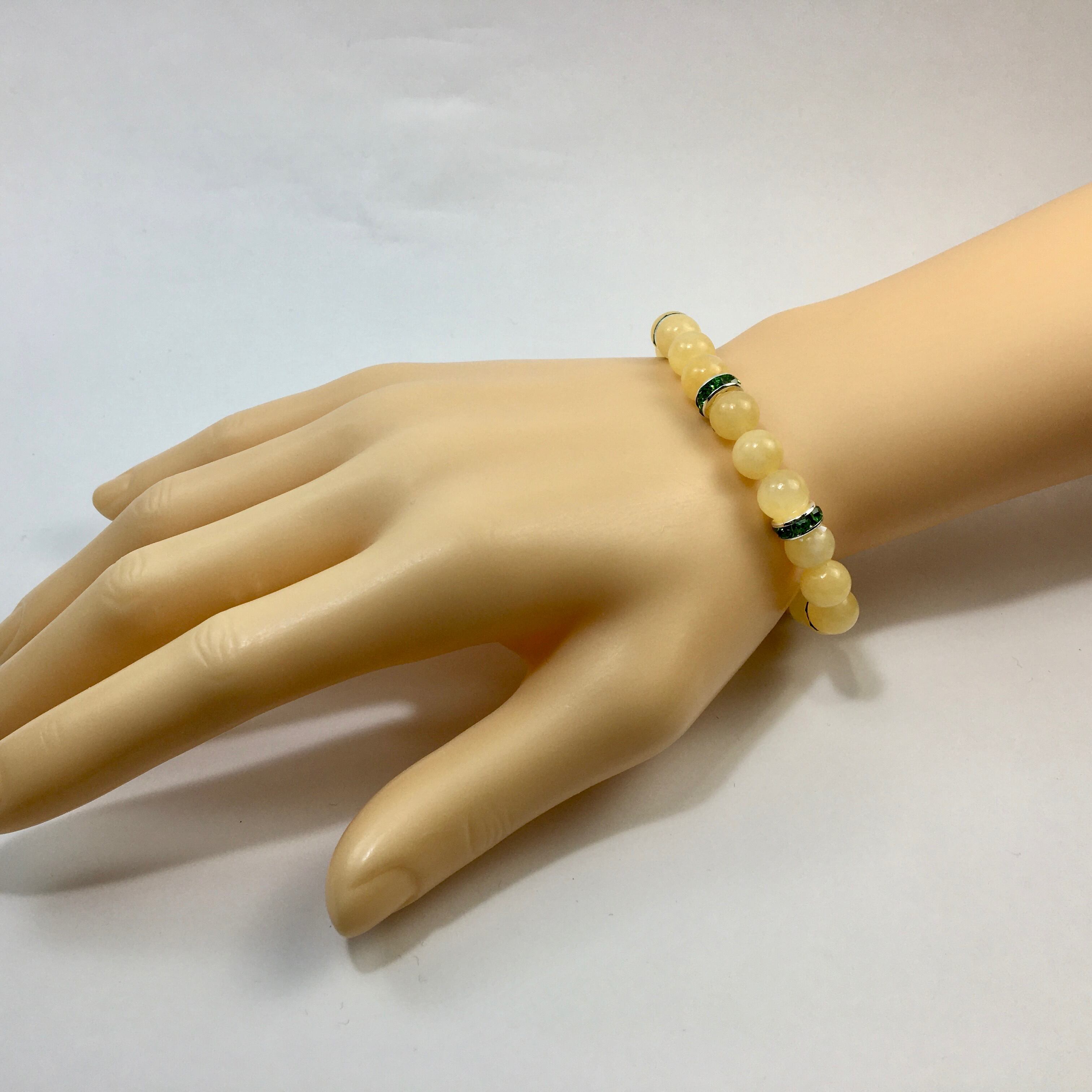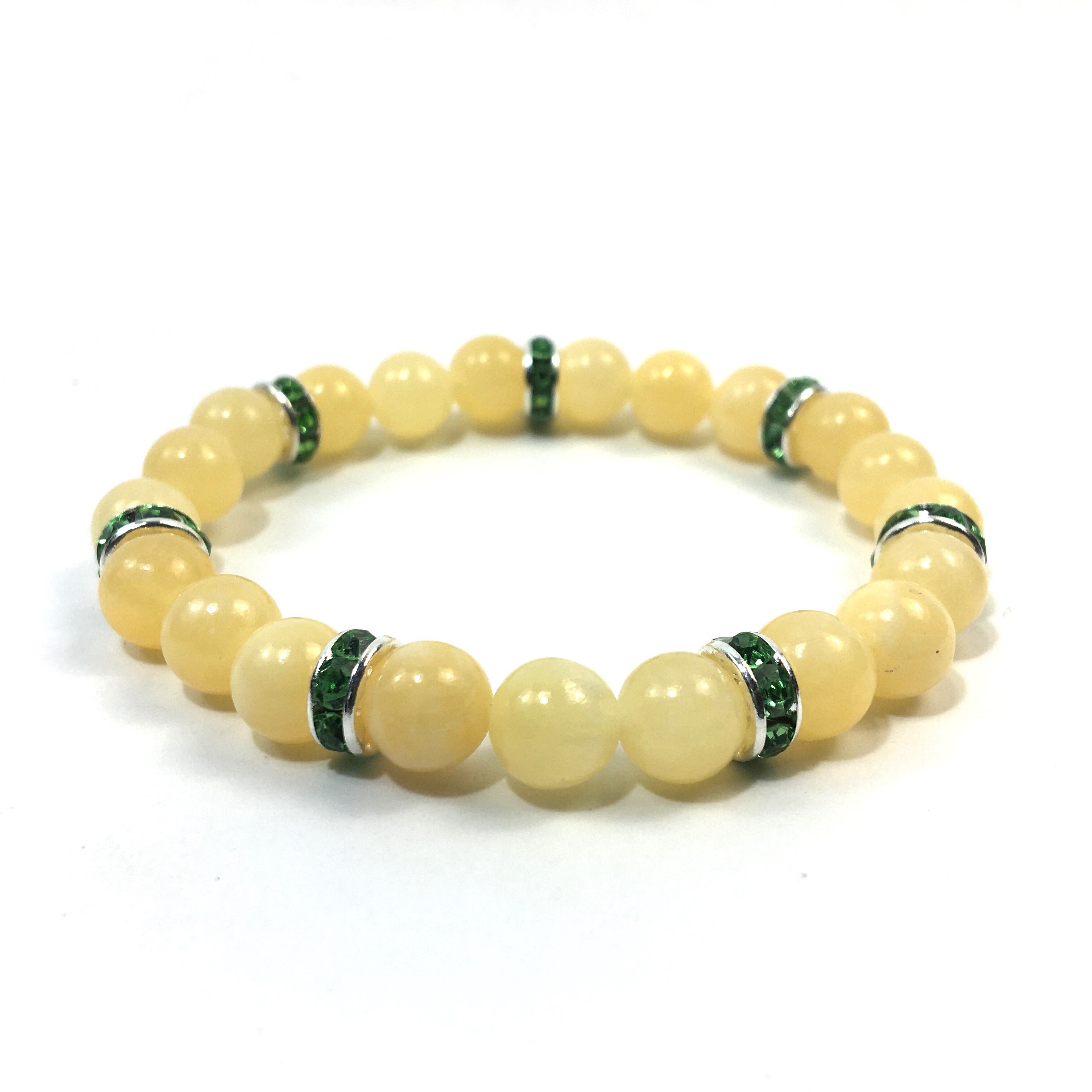 こちらは、8mm玉のアラゴナイトを使ったパワーストーンブレスレットです。シンプルなデザインでどんなコーディネートにも合わせやすいデザインに仕上げています。サイズは内周約15cmです。気になる方は是非この機会にどうぞ。