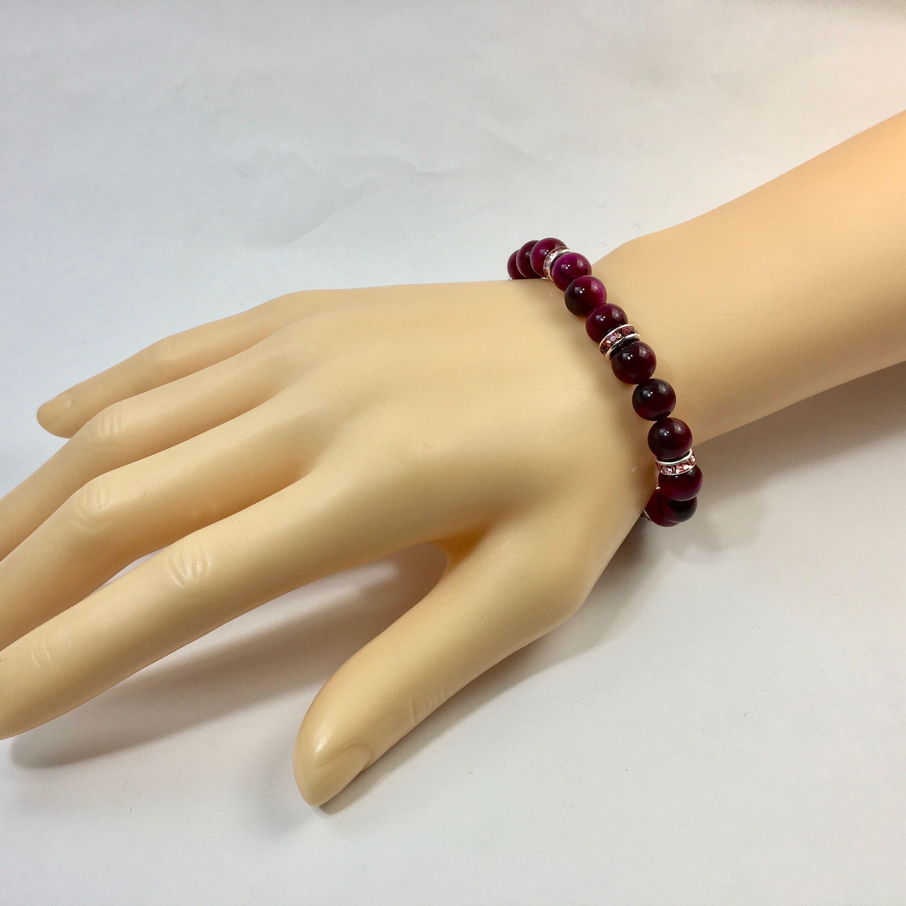 こちらは、8mm玉のピンクタイガーアイを使ったパワーストーンブレスレットです。シンプルなデザインでどんなコーディネートにも合わせやすいデザインに仕上げています。サイズは内周約15cmです。気になる方は是非この機会にどうぞ。