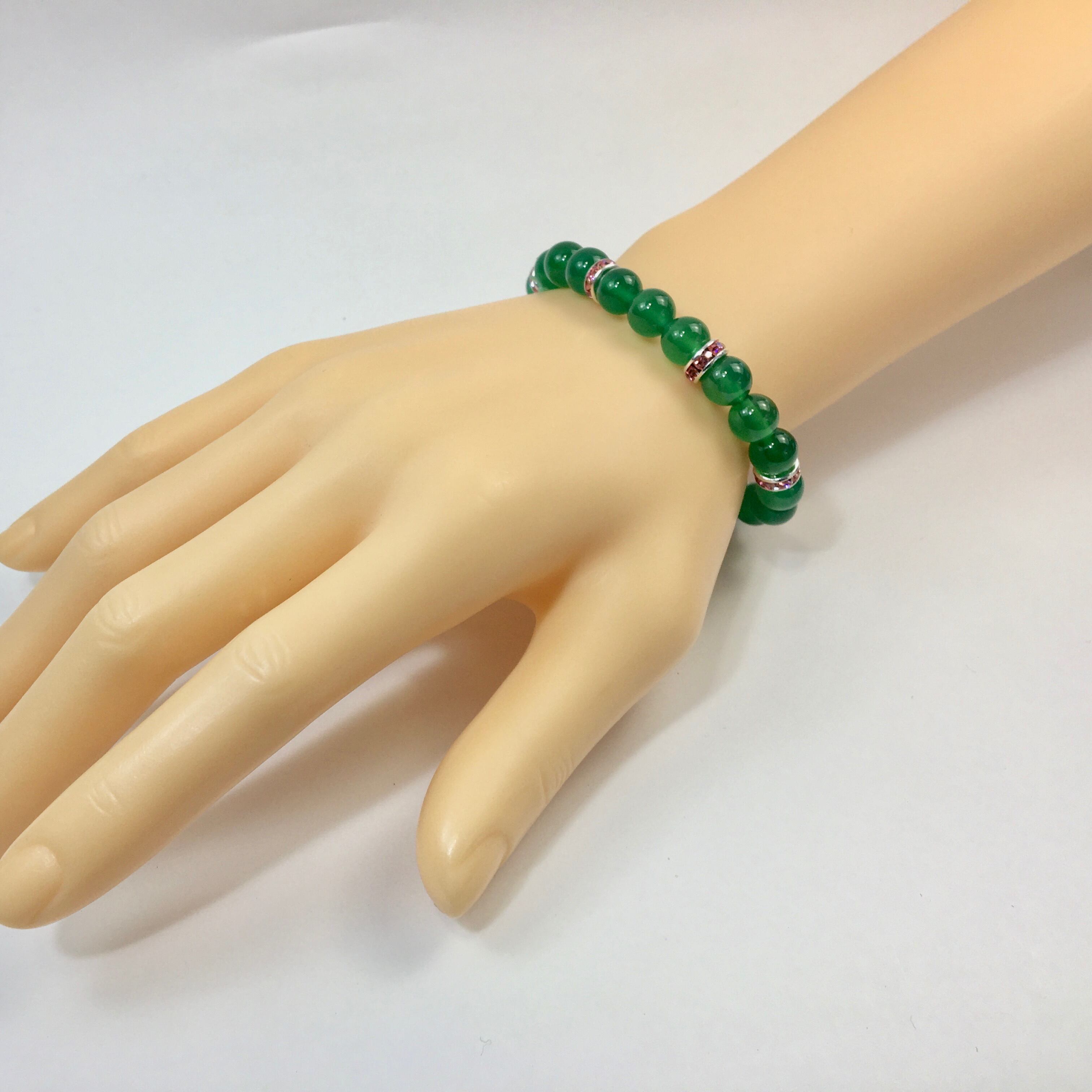 こちらは、8mm玉の緑瑪瑙を使ったパワーストーンブレスレットです。シンプルなデザインでどんなコーディネートにも合わせやすいデザインに仕上げています。サイズは内周約15cmです。気になる方は是非この機会にどうぞ。