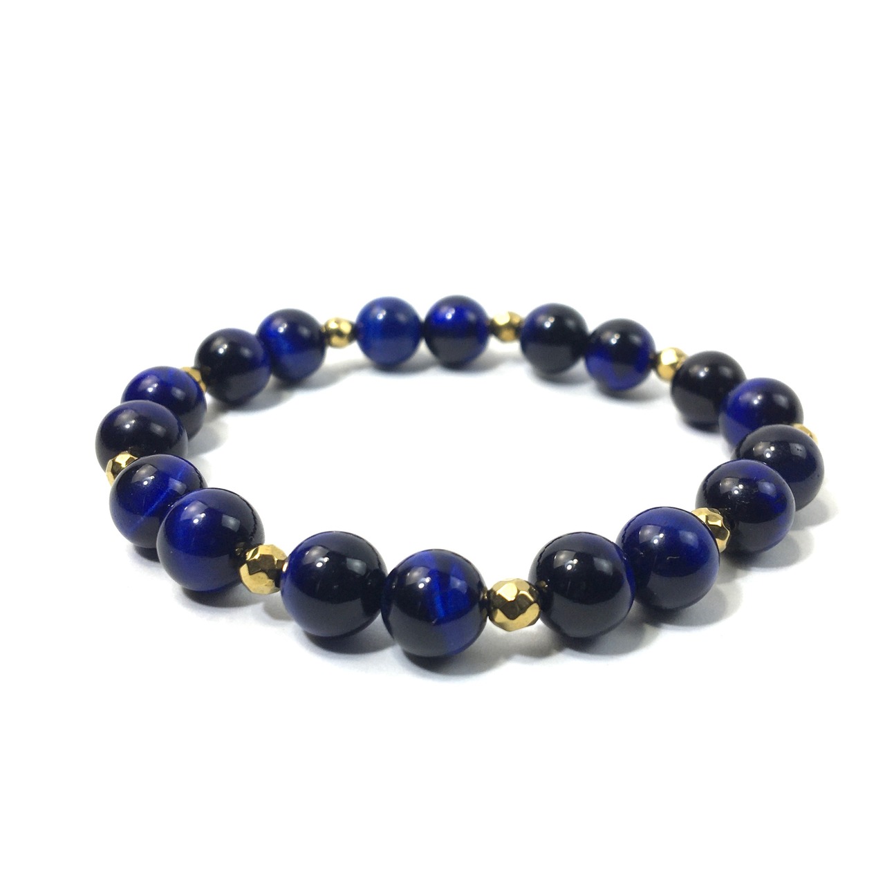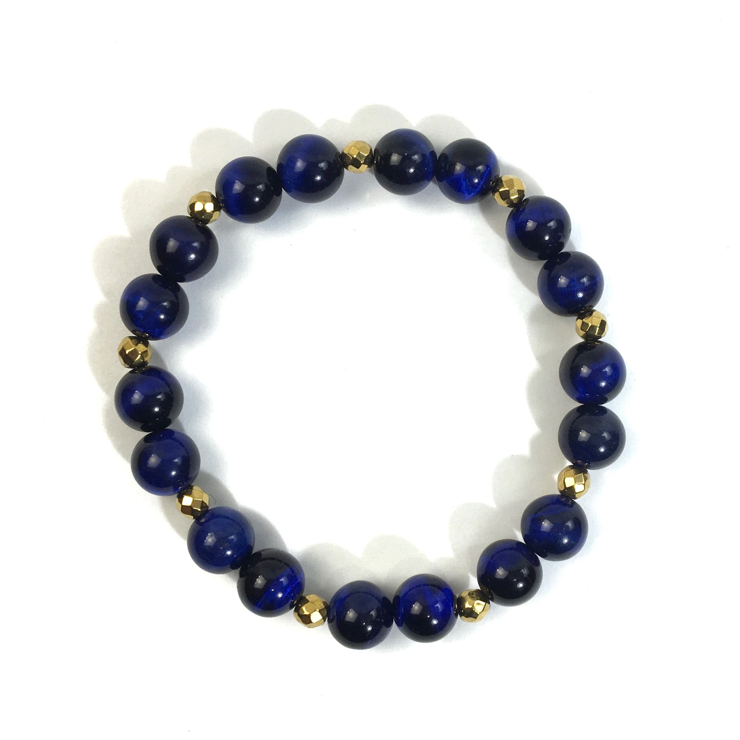 こちらは、8mm玉のブルータイガーアイを使ったパワーストーンブレスレットです。今回は石との間にはゴールドのヘマタイトを加えアクセントとしております。シンプルなデザインでどんなコーディネートにも合わせやすいデザインに仕上げています。サイズは内周約15cmです。気になる方は是非この機会にどうぞ。