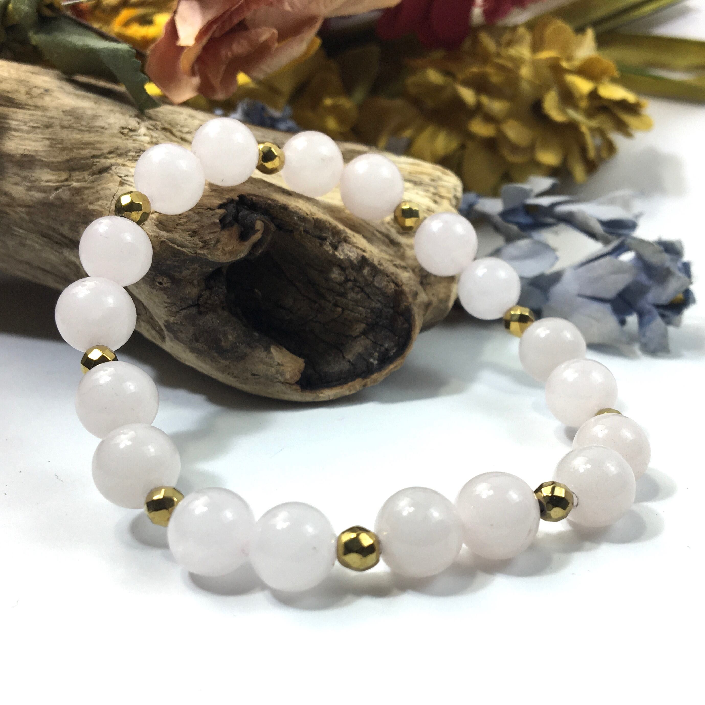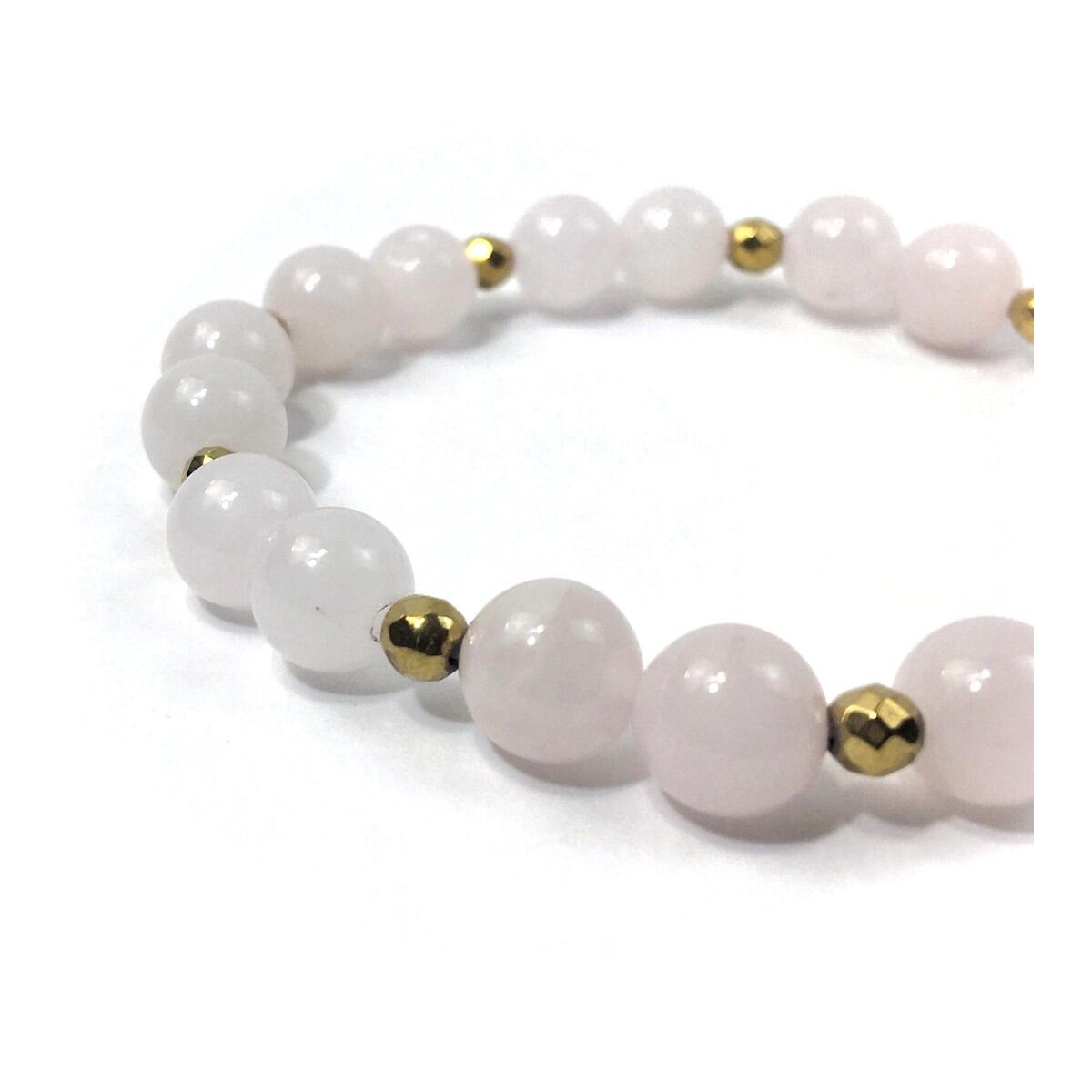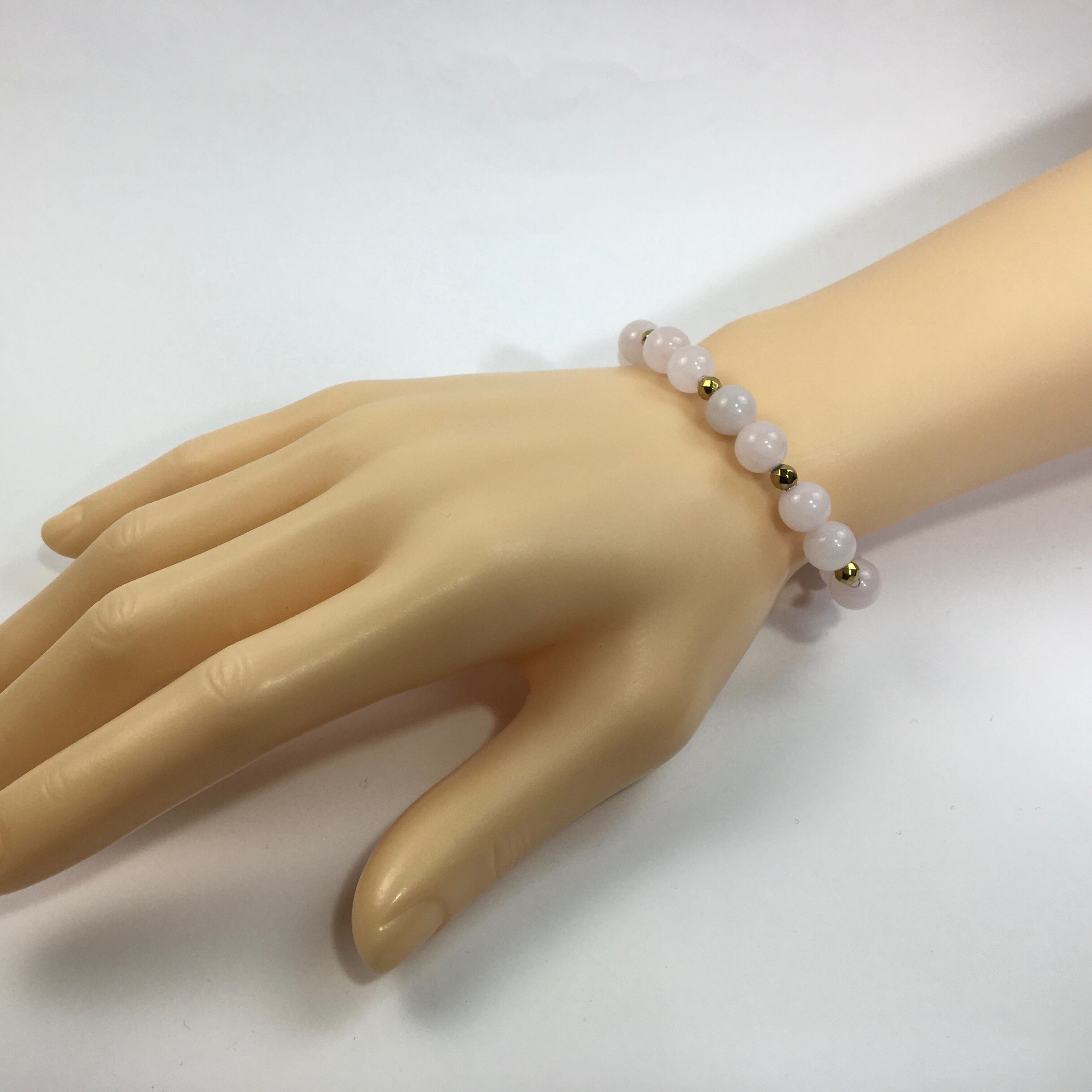 こちらは、8mm玉のローズクォーツを使ったパワーストーンブレスレットです。今回は石との間にはゴールドのヘマタイトを加えアクセントとしております。シンプルなデザインでどんなコーディネートにも合わせやすいデザインに仕上げています。サイズは内周約15cmです。気になる方は是非この機会にどうぞ。
