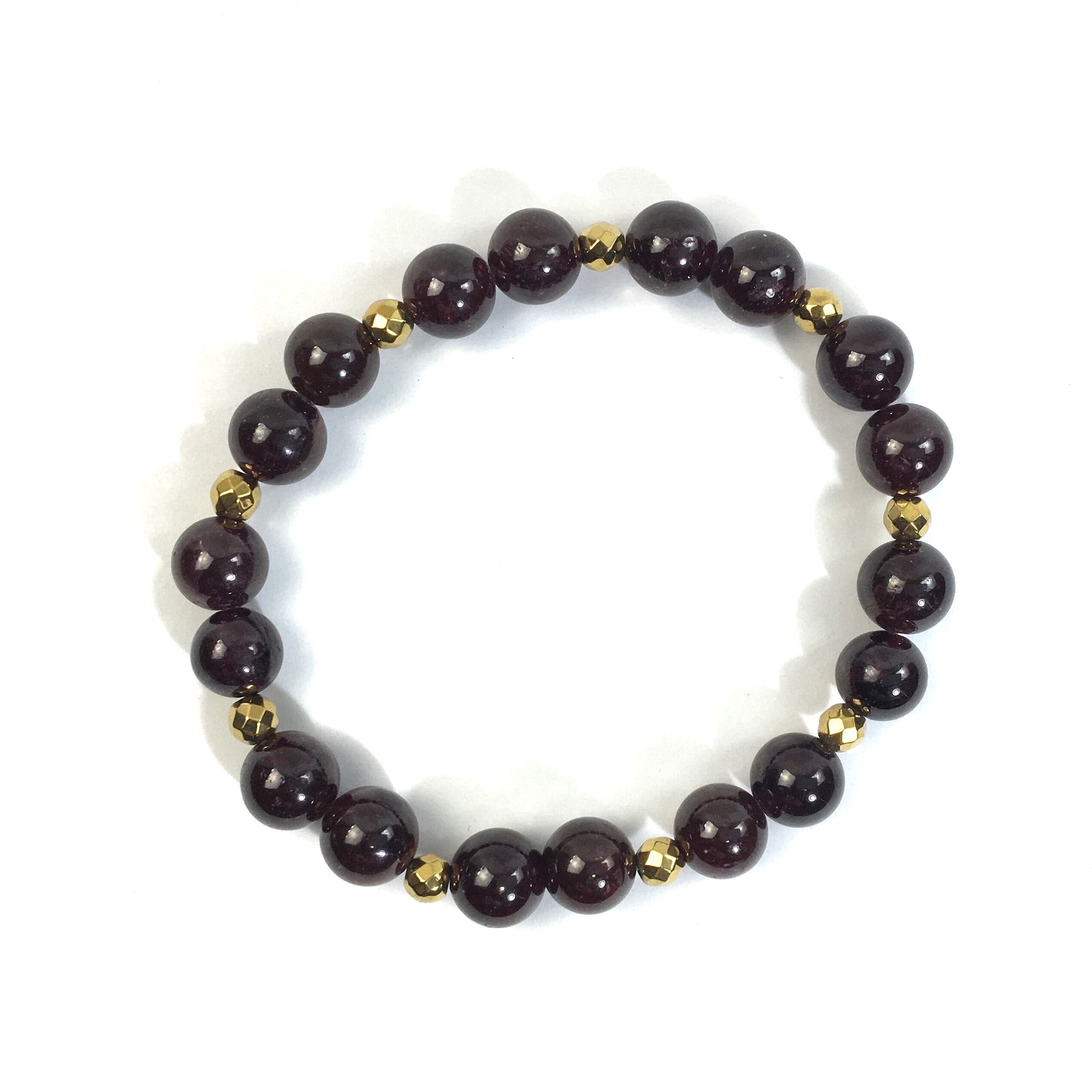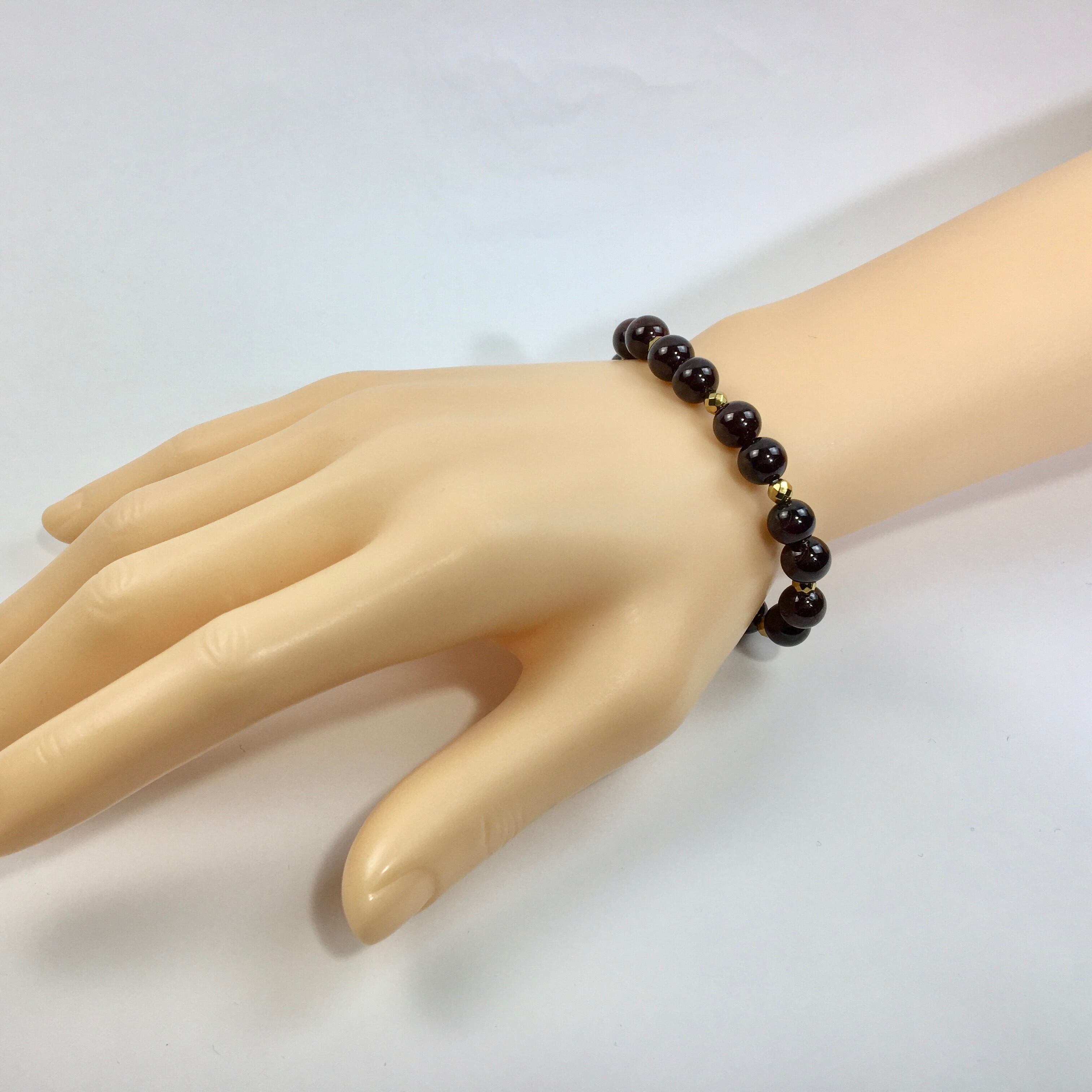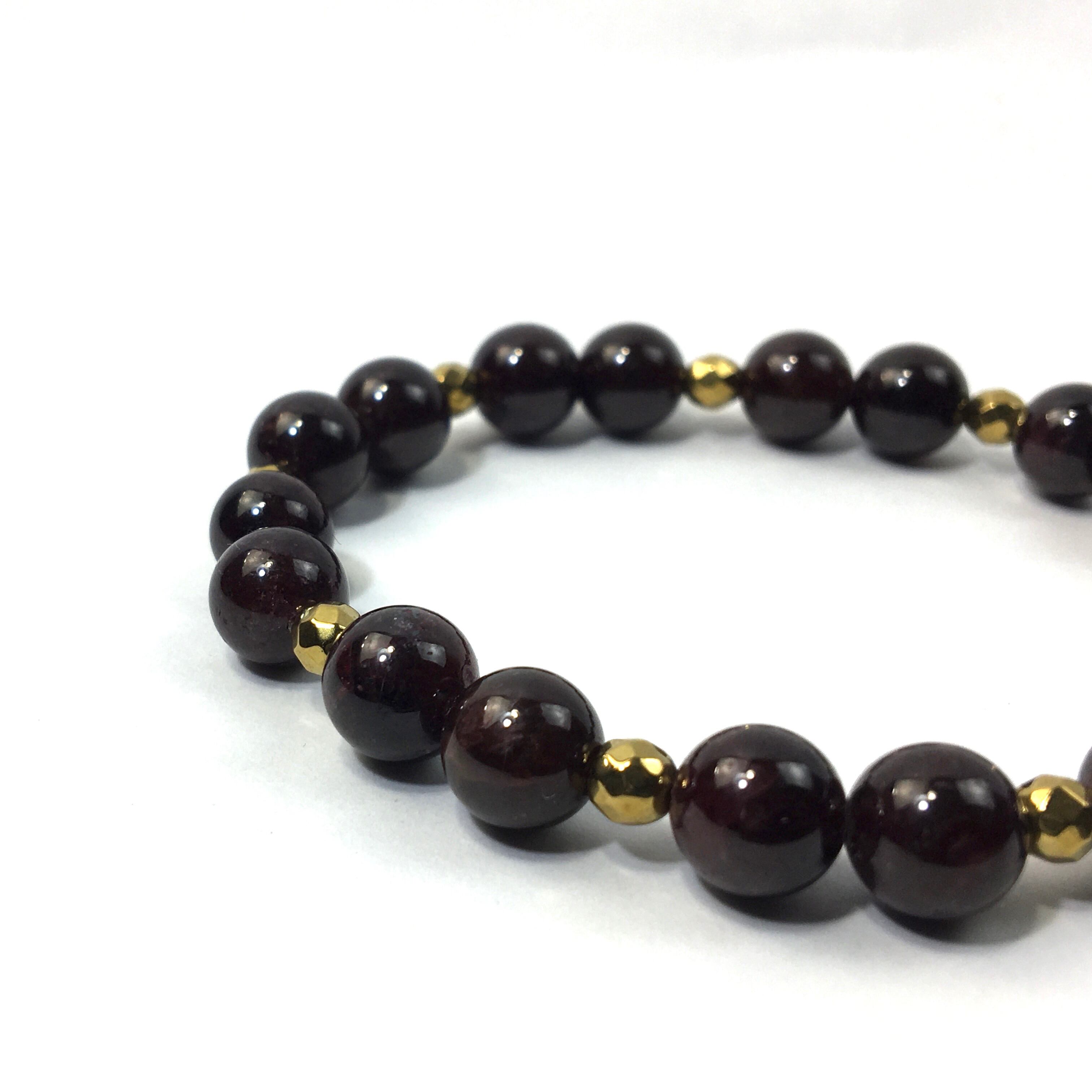 こちらは、8mm玉のガーネットを使ったパワーストーンブレスレットです。今回は石との間にはゴールドのヘマタイトを加えアクセントとしております。シンプルなデザインでどんなコーディネートにも合わせやすいデザインに仕上げています。サイズは内周約15cmです。気になる方は是非この機会にどうぞ。
