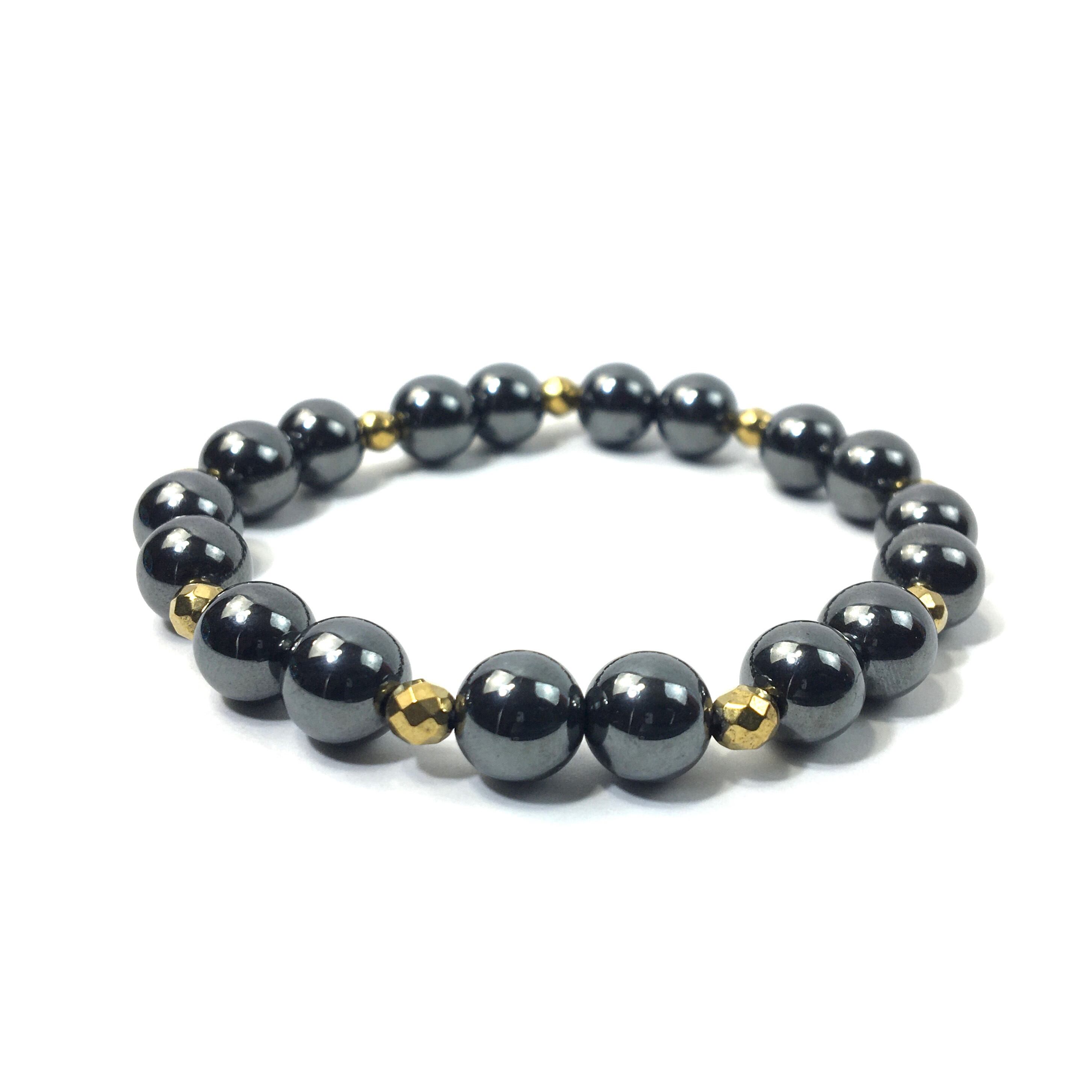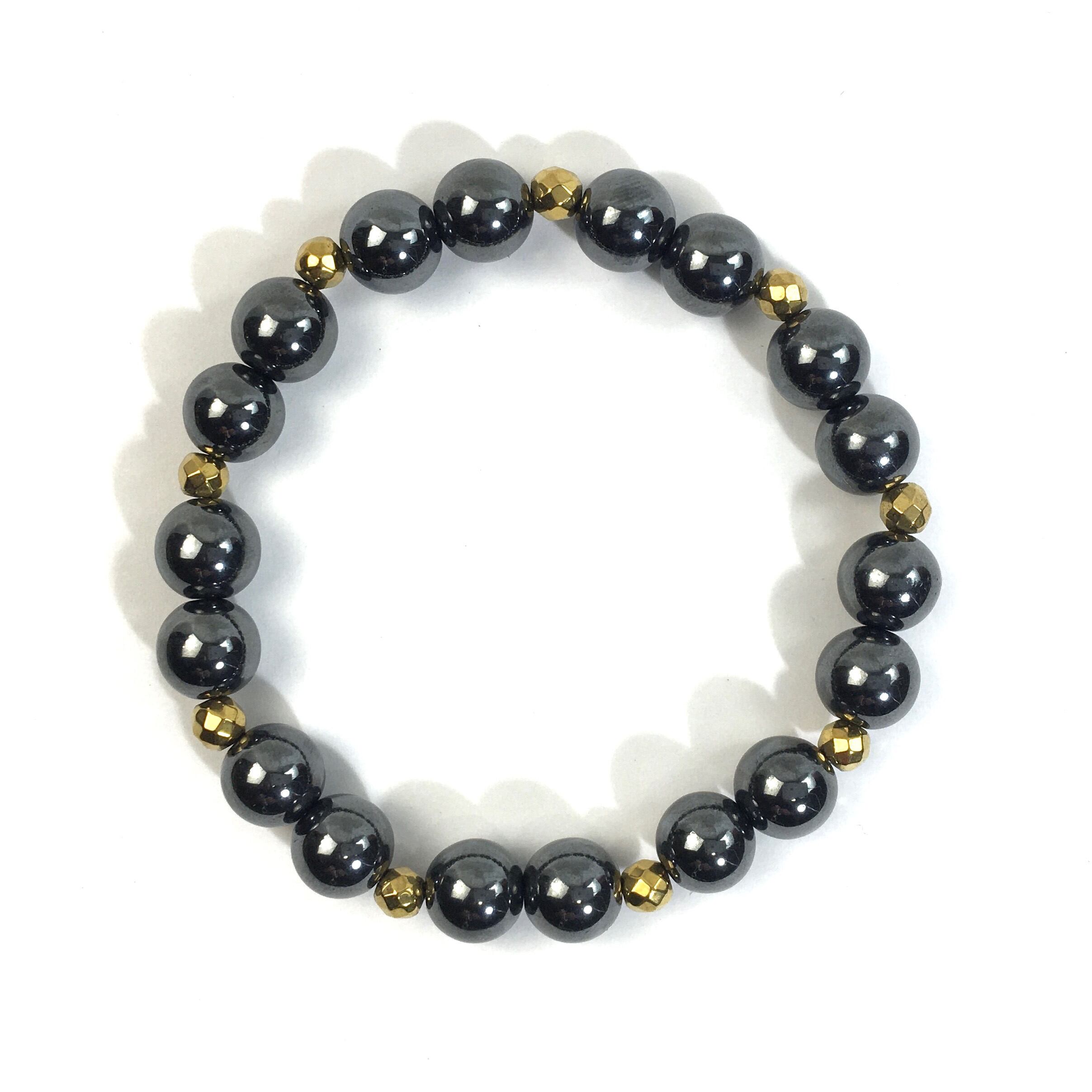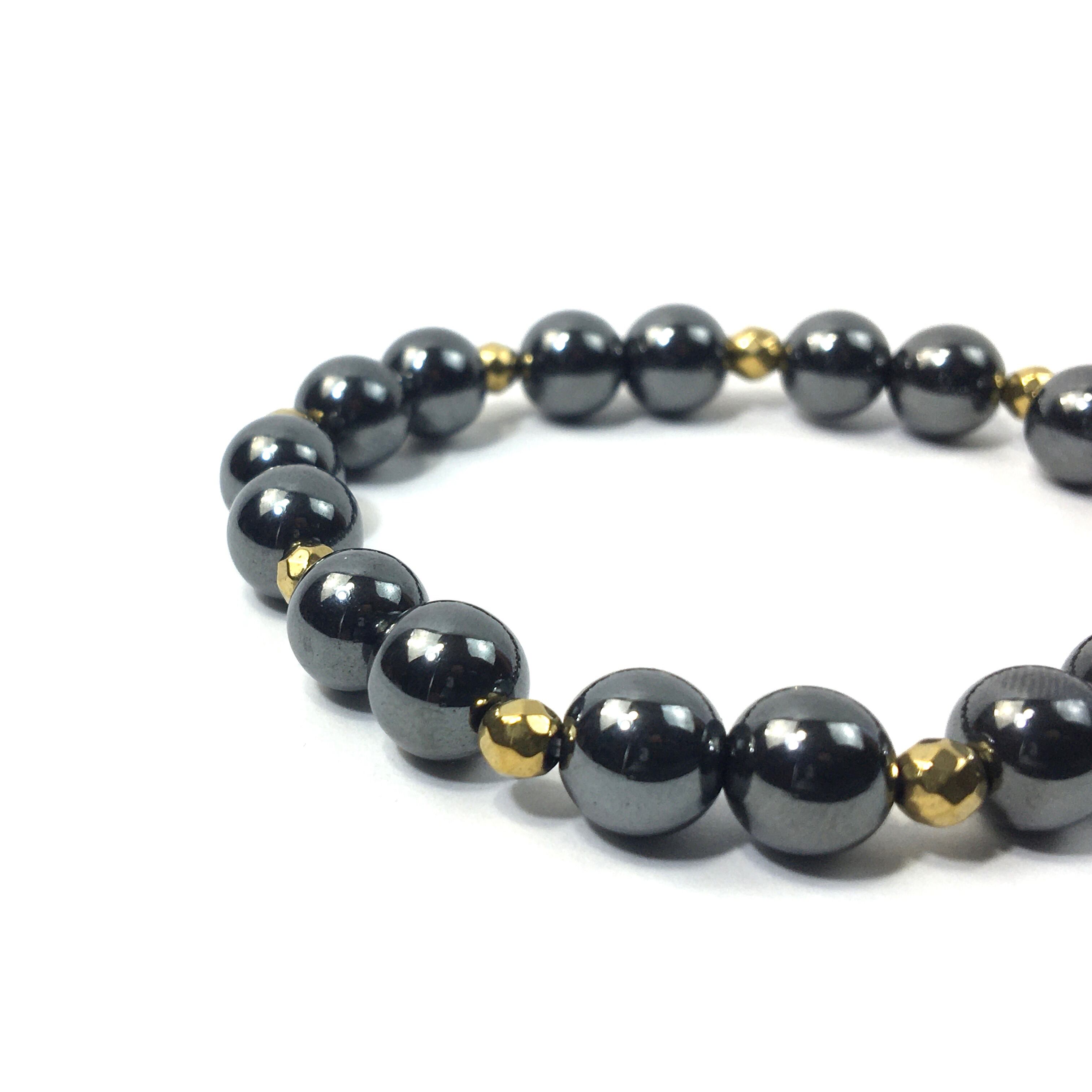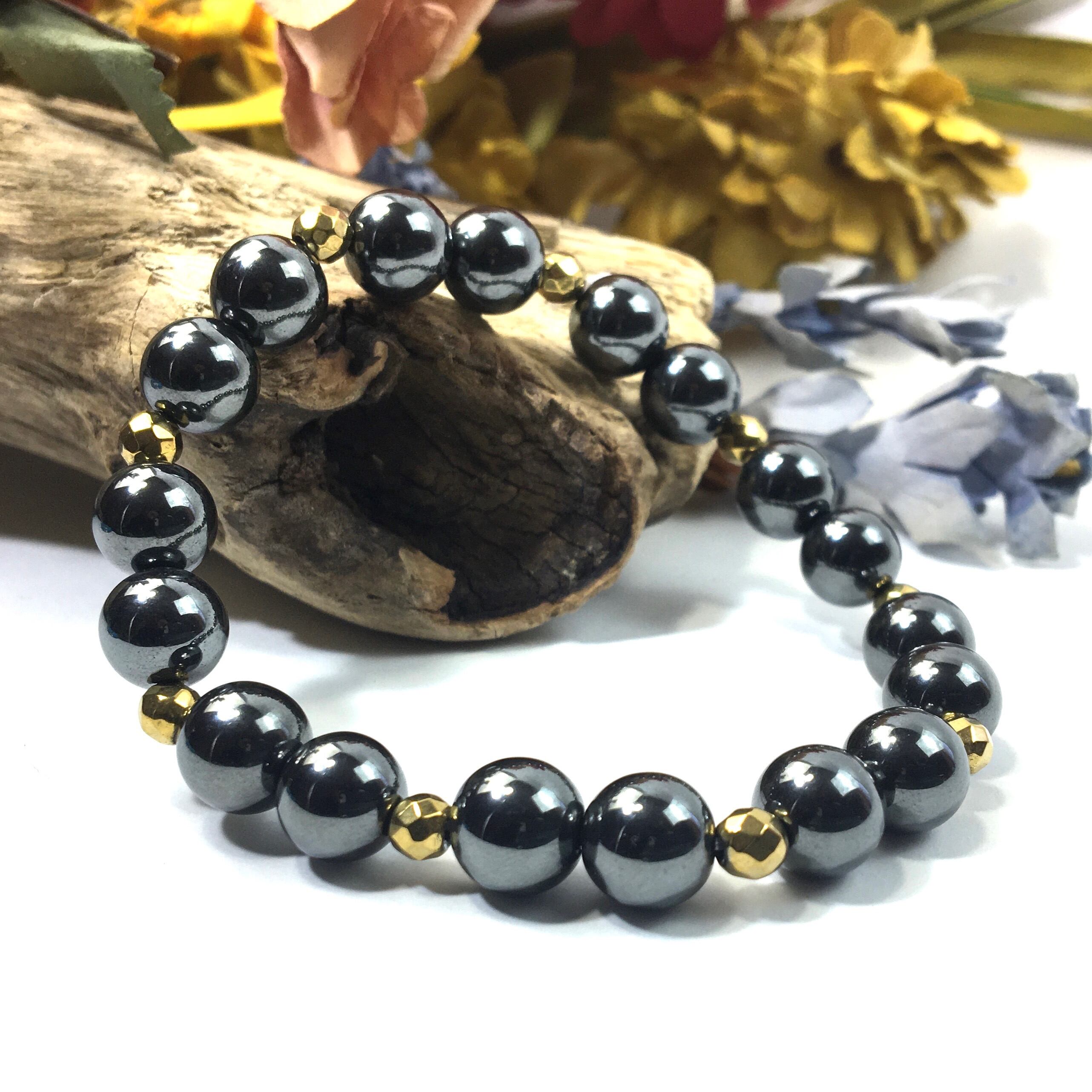 こちらは、8mm玉のヘマタイトを使ったパワーストーンブレスレットです。今回は石との間にはゴールドのヘマタイトを加えアクセントとしております。シンプルなデザインでどんなコーディネートにも合わせやすいデザインに仕上げています。サイズは内周約15cmです。気になる方は是非この機会にどうぞ。