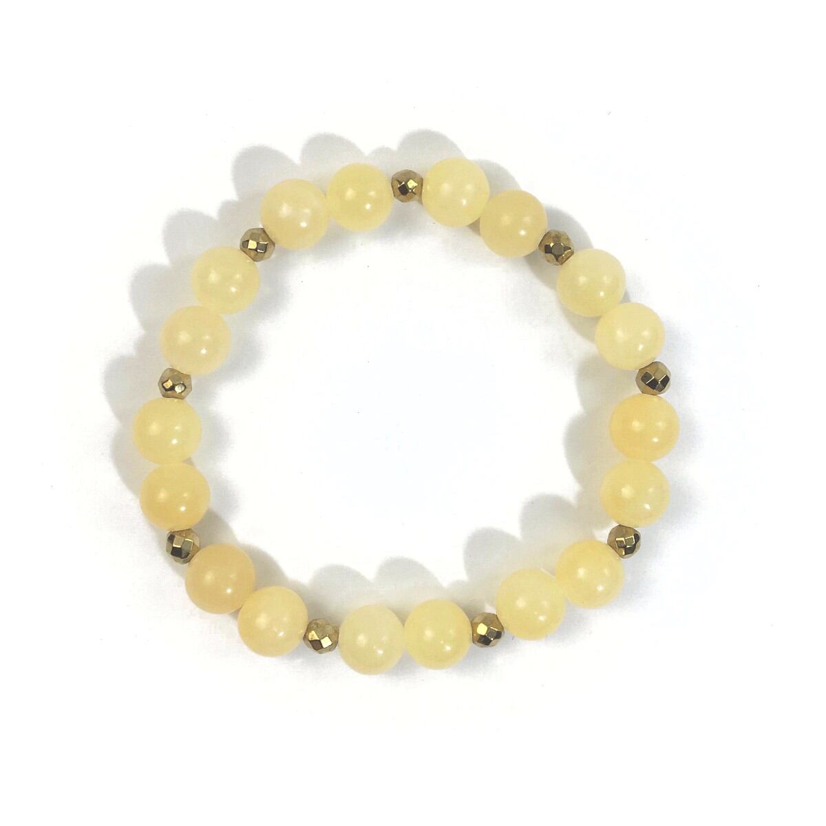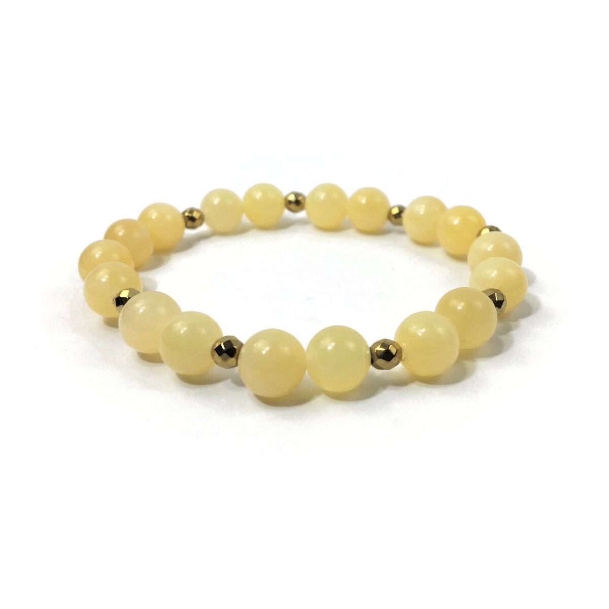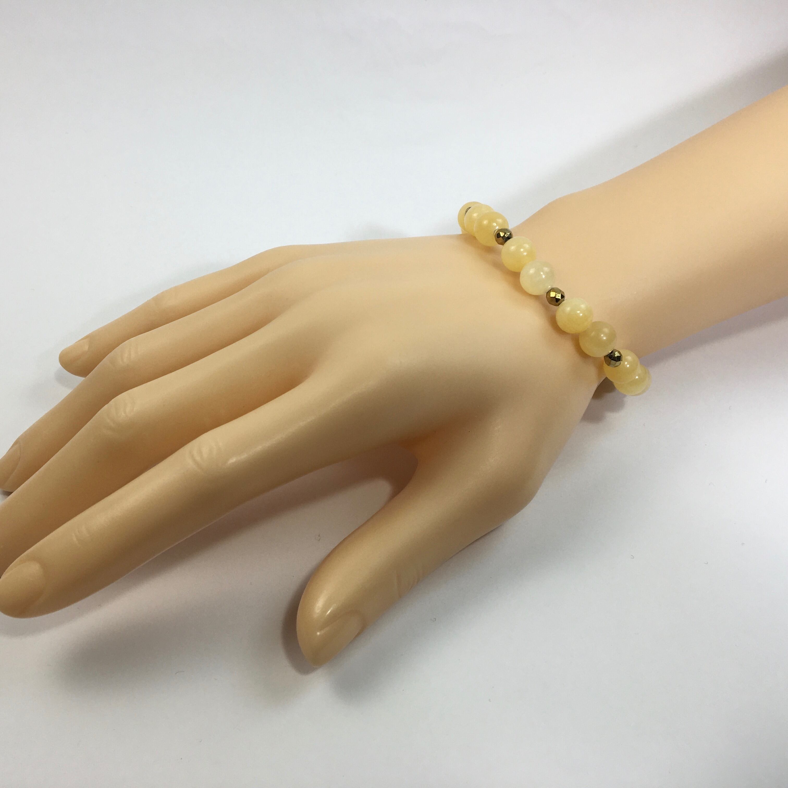 こちらは、8mm玉のアラゴナイトを使ったパワーストーンブレスレットです。今回は石との間にはゴールドのヘマタイトを加えアクセントとしております。シンプルなデザインでどんなコーディネートにも合わせやすいデザインに仕上げています。サイズは内周約15cmです。気になる方は是非この機会にどうぞ。
