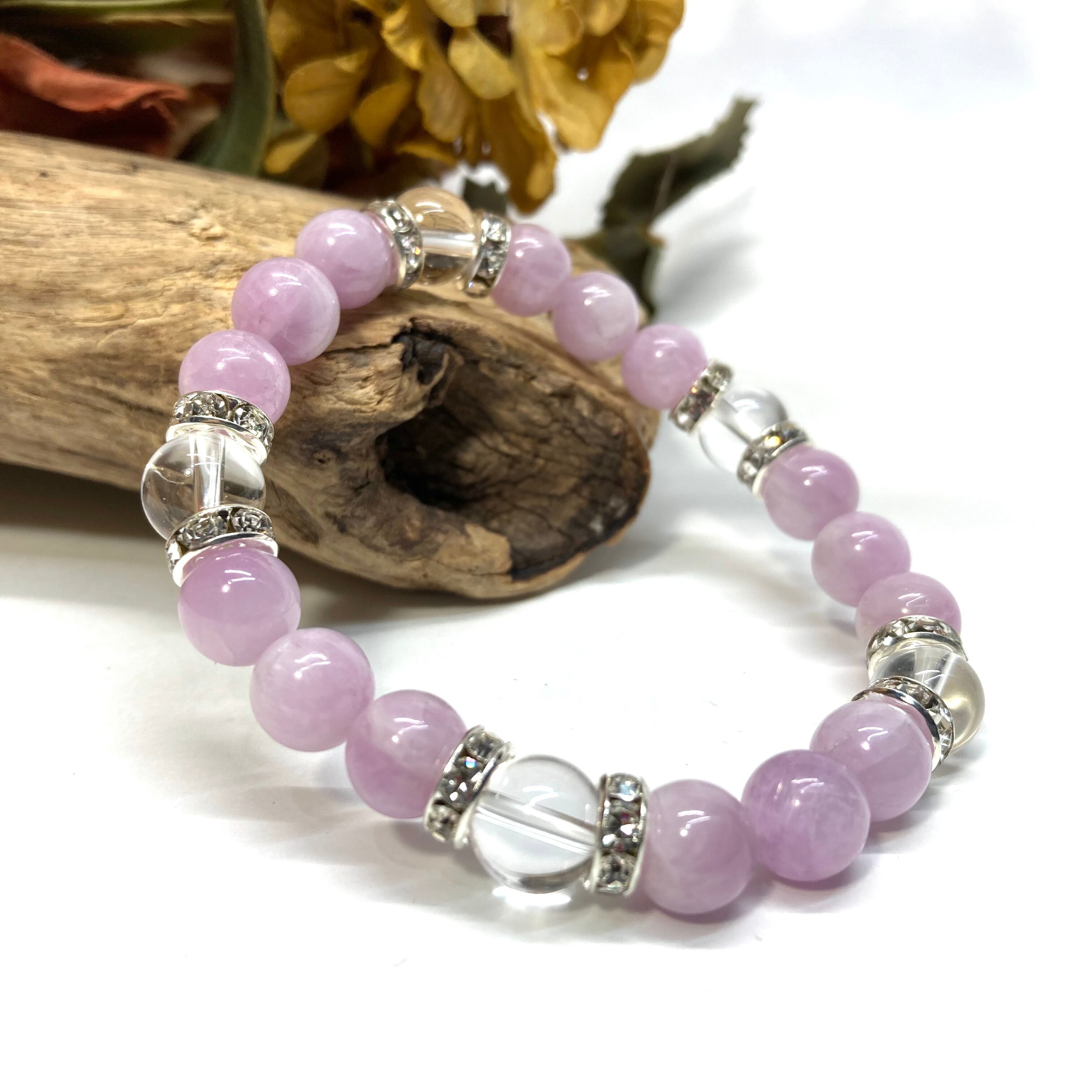 こちらは、8mm玉のクンツァイトと水晶を使ったパワーストーンブレスレットです。シンプルなデザインでどんなコーディネートにも合わせやすいデザインに仕上げています。サイズは内周約15cmです。気になる方は是非この機会にどうぞ。