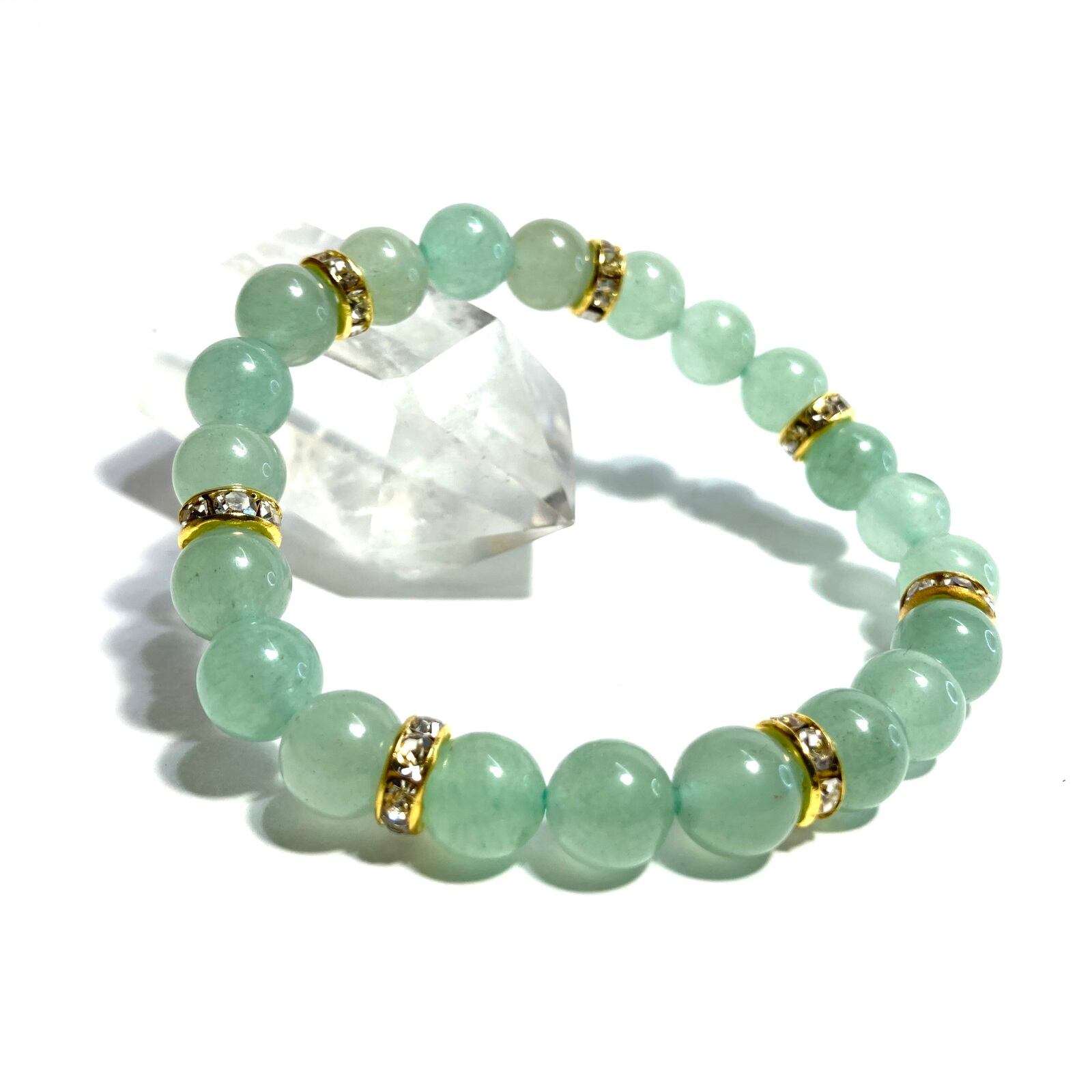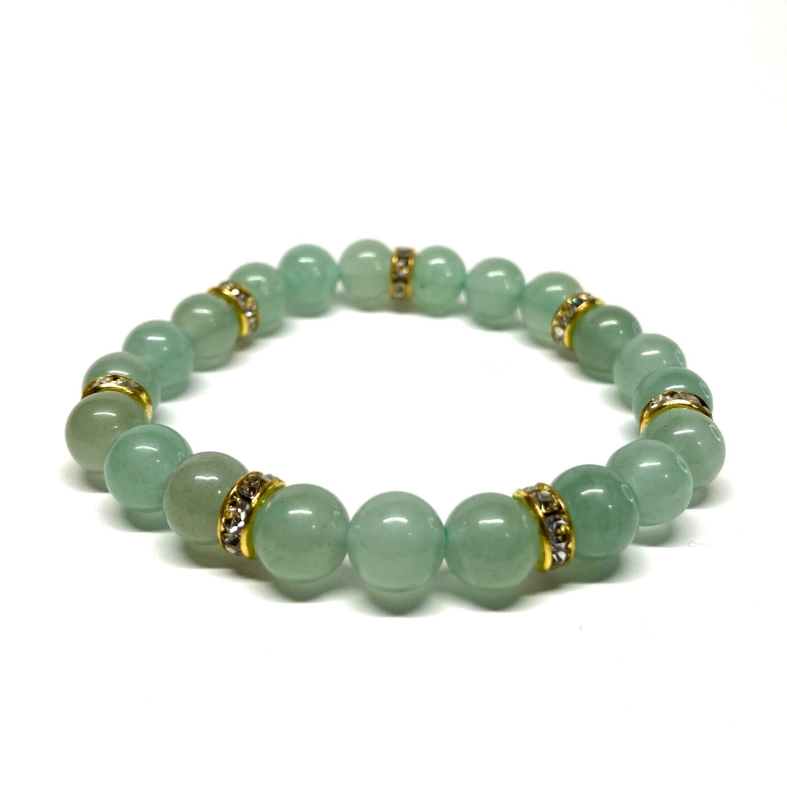 こちらは、8mm玉のアベンチュリンを使ったパワーストーンブレスレットです。シンプルなデザインでどんなコーディネートにも合わせやすいデザインに仕上げています。サイズは内周約15cmです。気になる方は是非この機会にどうぞ。
