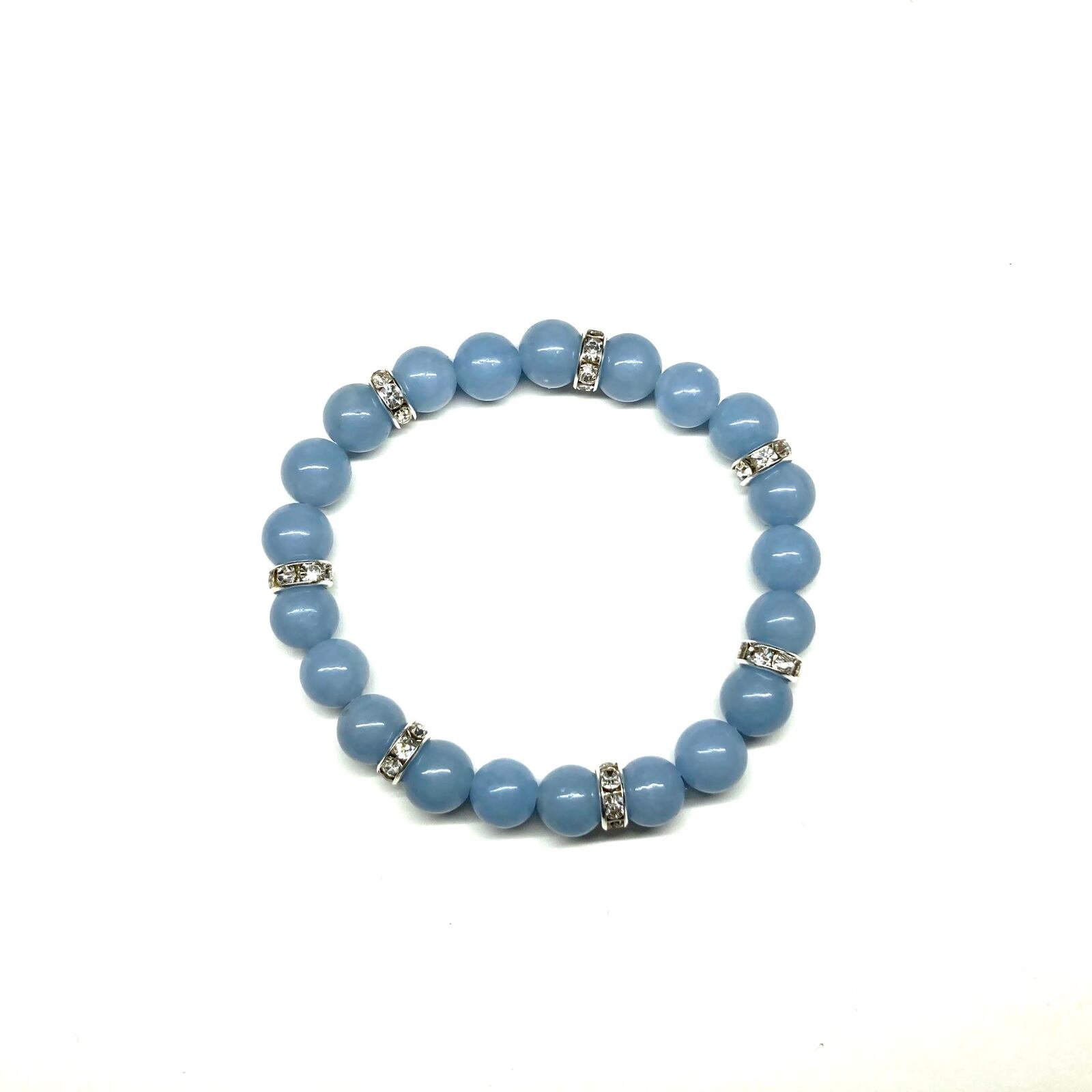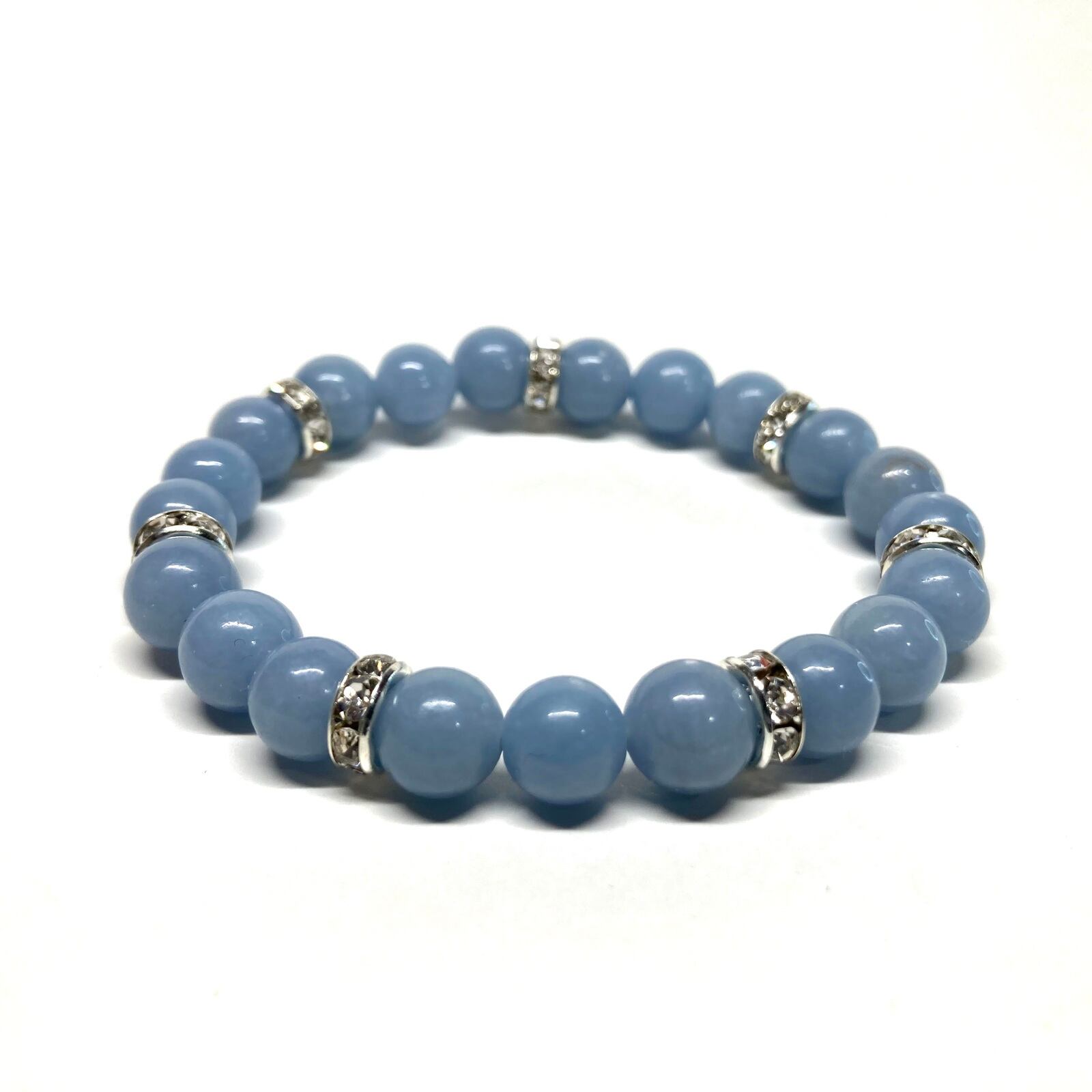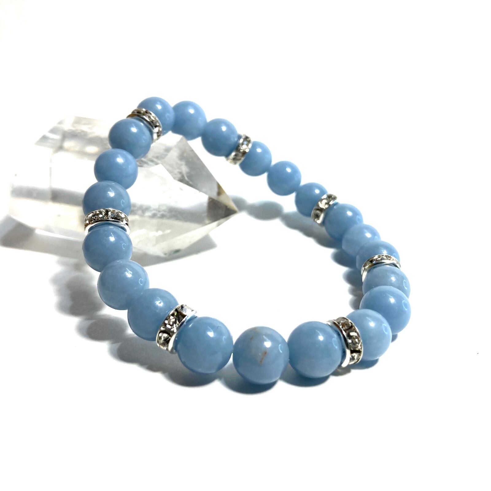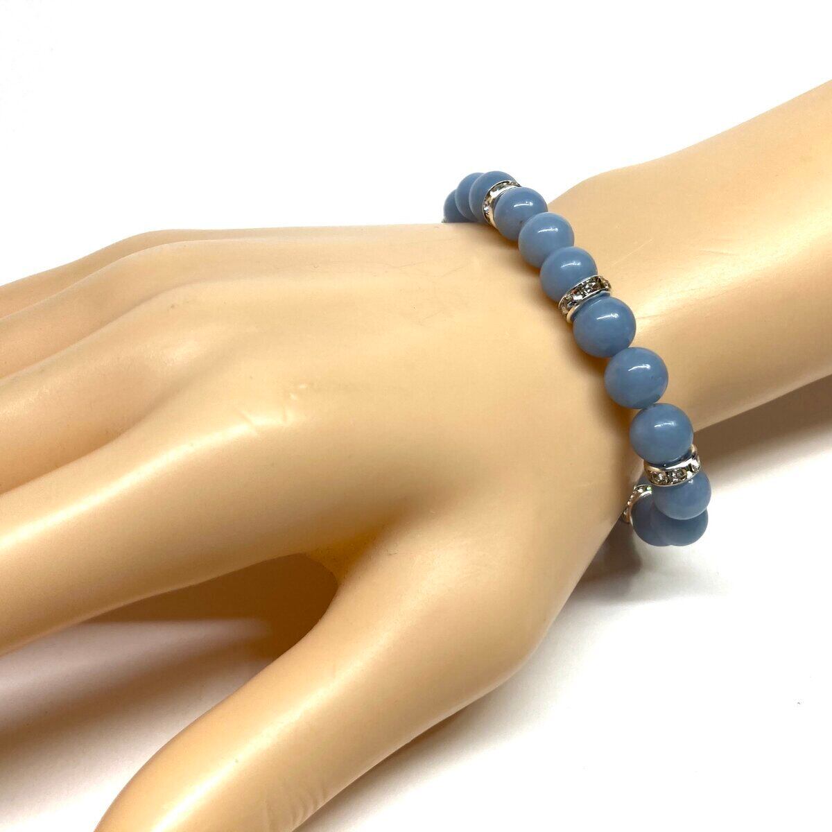 こちらは、8mm玉のエンジェライトを使ったパワーストーンブレスレットです。シンプルなデザインでどんなコーディネートにも合わせやすいデザインに仕上げています。サイズは内周約15cmです。気になる方は是非この機会にどうぞ。