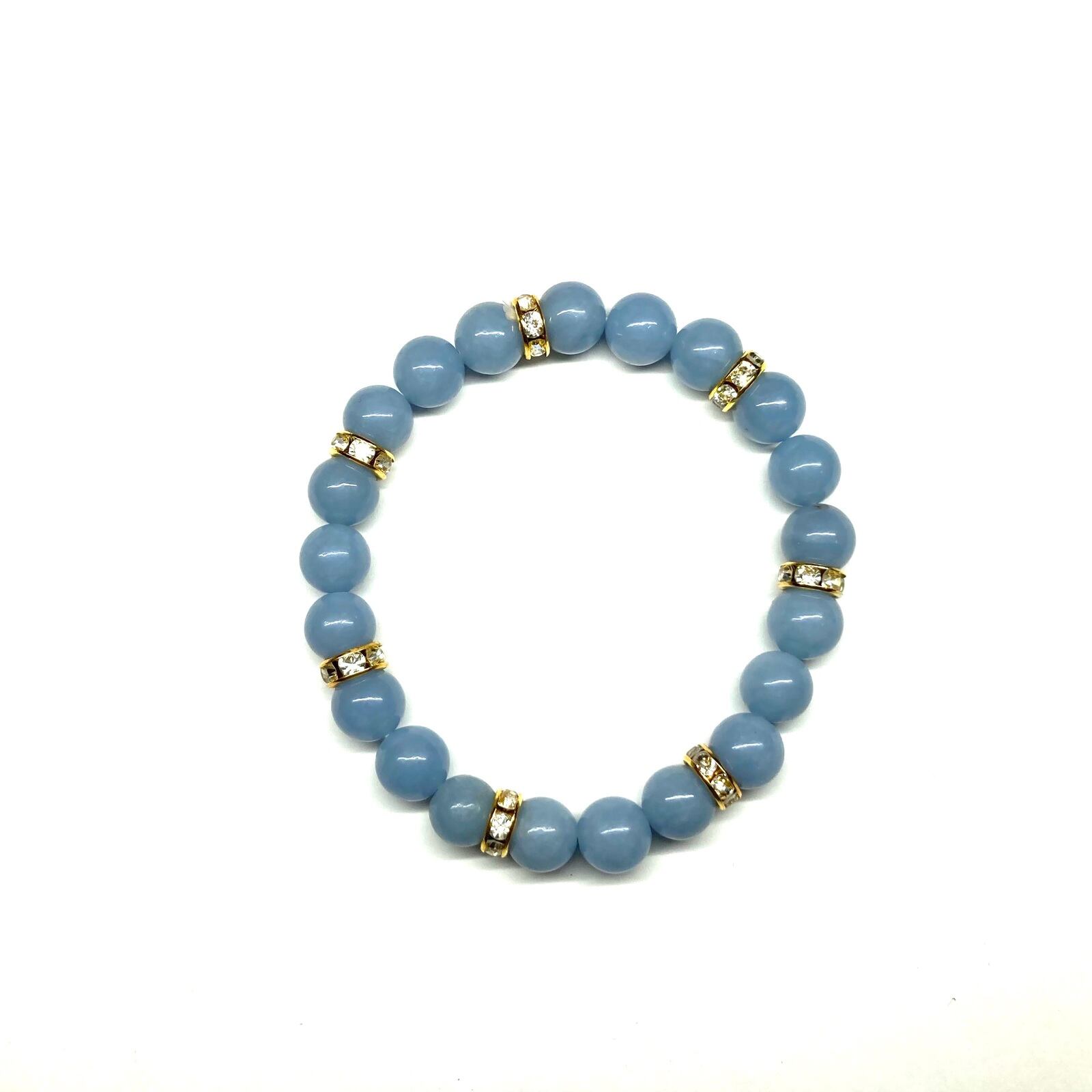 こちらは、8mm玉のエンジェライトを使ったパワーストーンブレスレットです。シンプルなデザインでどんなコーディネートにも合わせやすいデザインに仕上げています。サイズは内周約15cmです。気になる方は是非この機会にどうぞ。