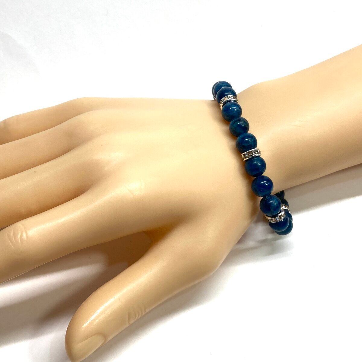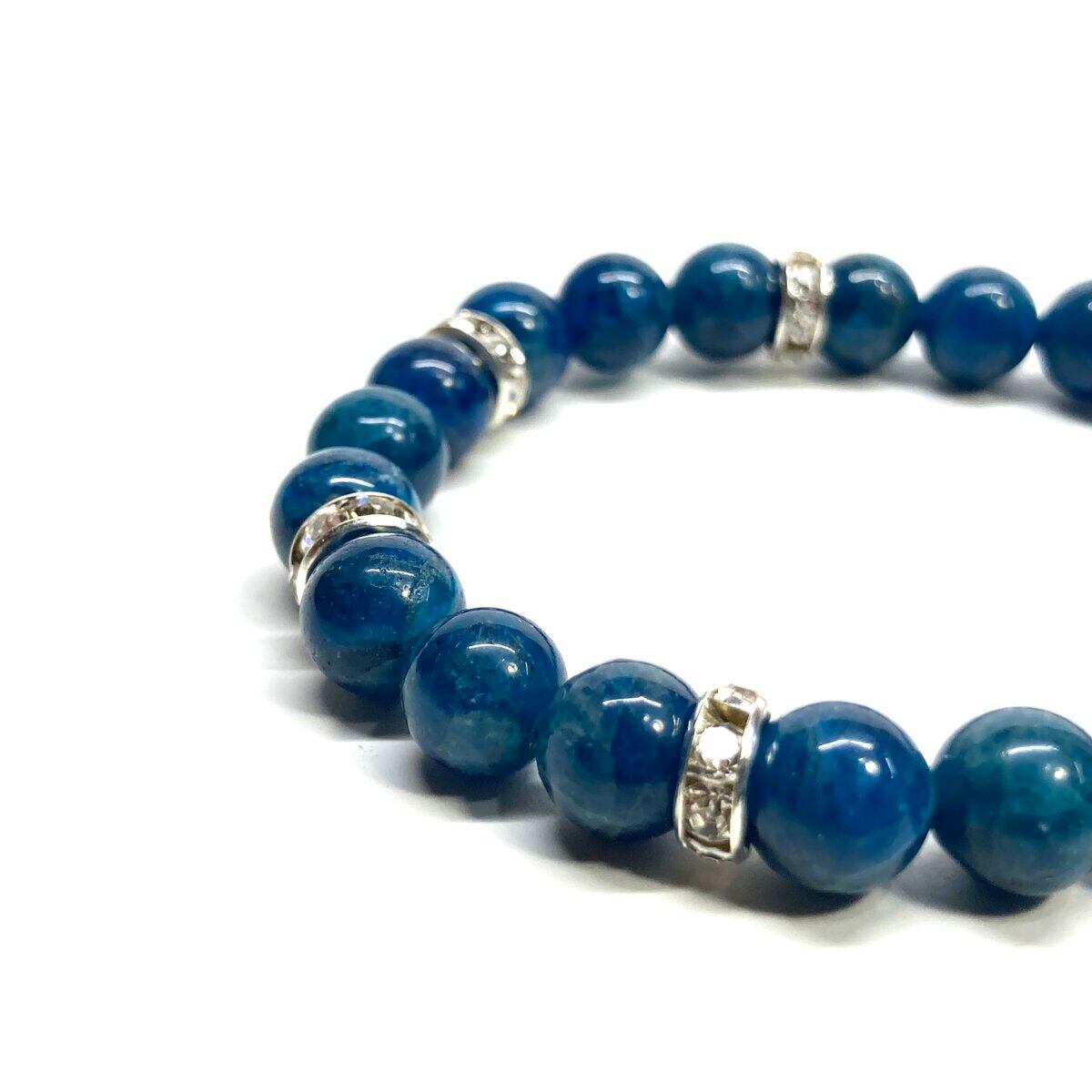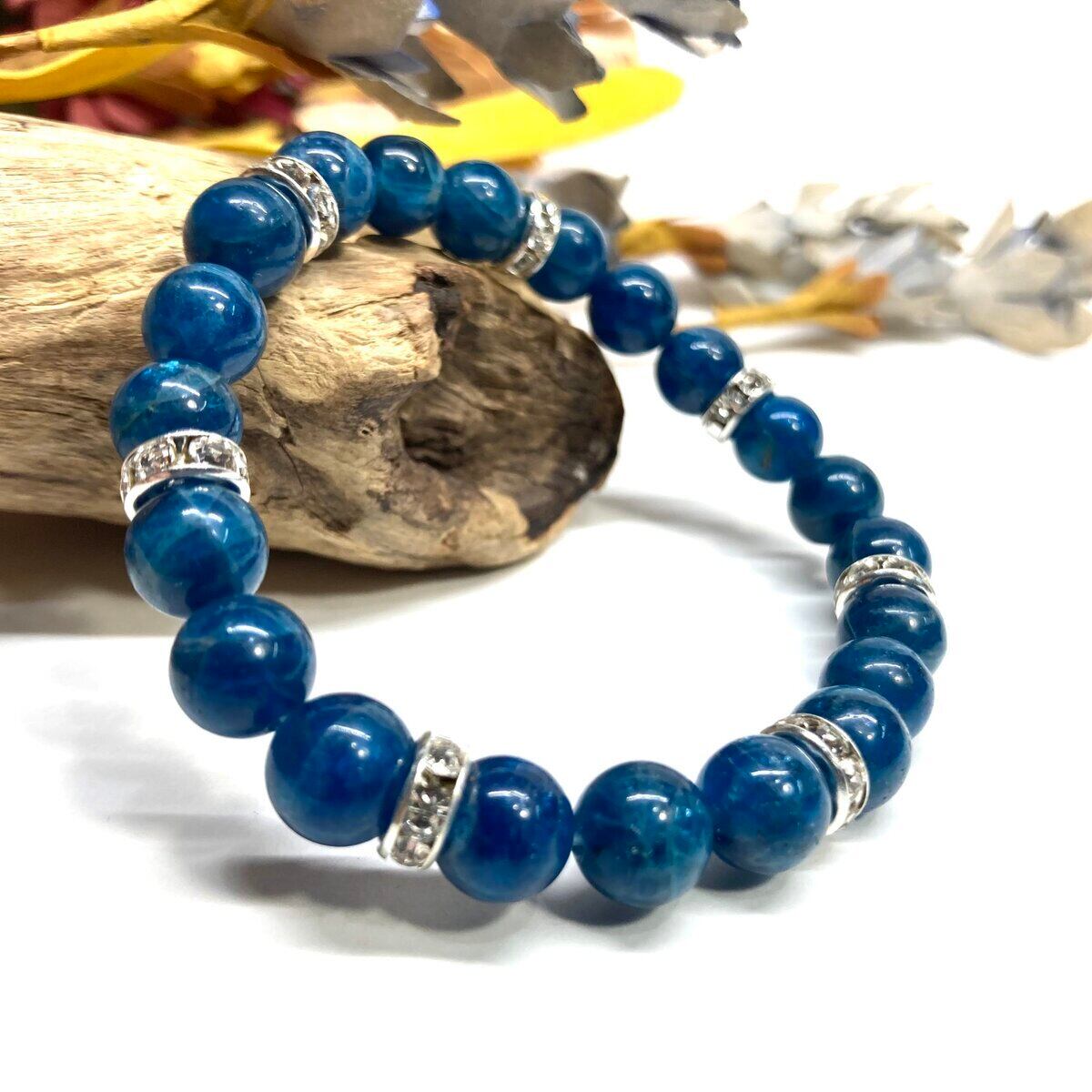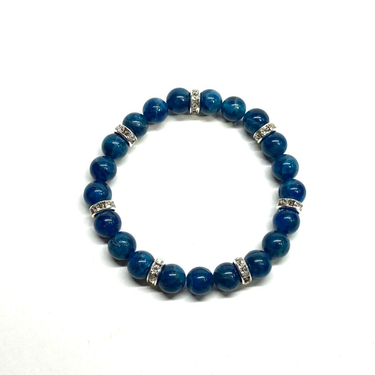 こちらは、8mm玉のアパタイトを使ったパワーストーンブレスレットです。シンプルなデザインでどんなコーディネートにも合わせやすいデザインに仕上げています。サイズは内周約15cmです。気になる方は是非この機会にどうぞ。