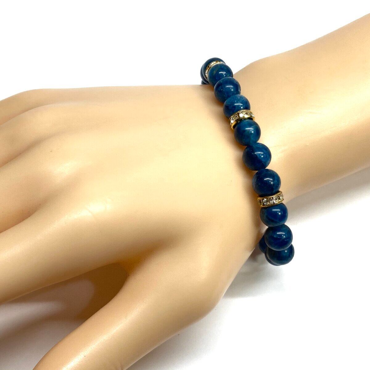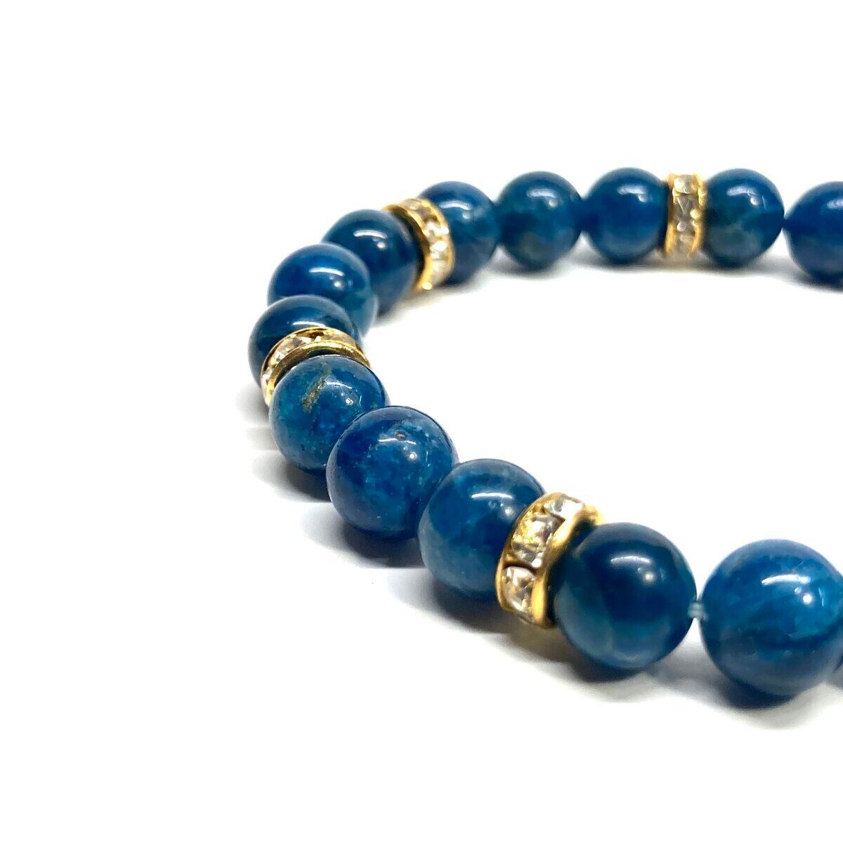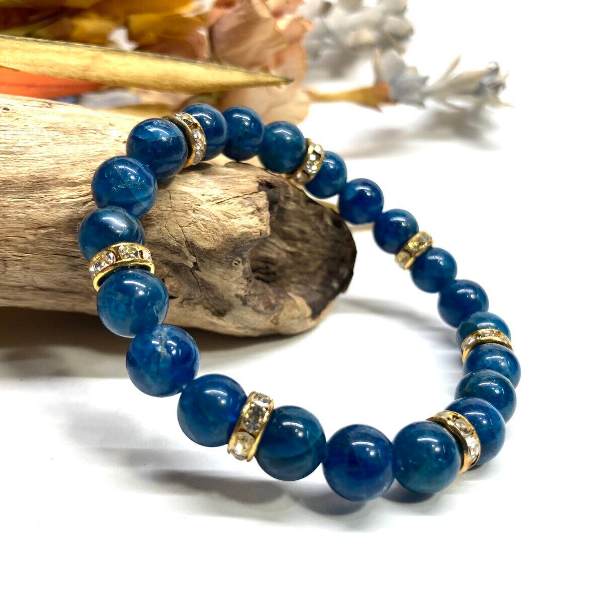 こちらは、8mm玉のアパタイトを使ったパワーストーンブレスレットです。シンプルなデザインでどんなコーディネートにも合わせやすいデザインに仕上げています。サイズは内周約15cmです。気になる方は是非この機会にどうぞ。