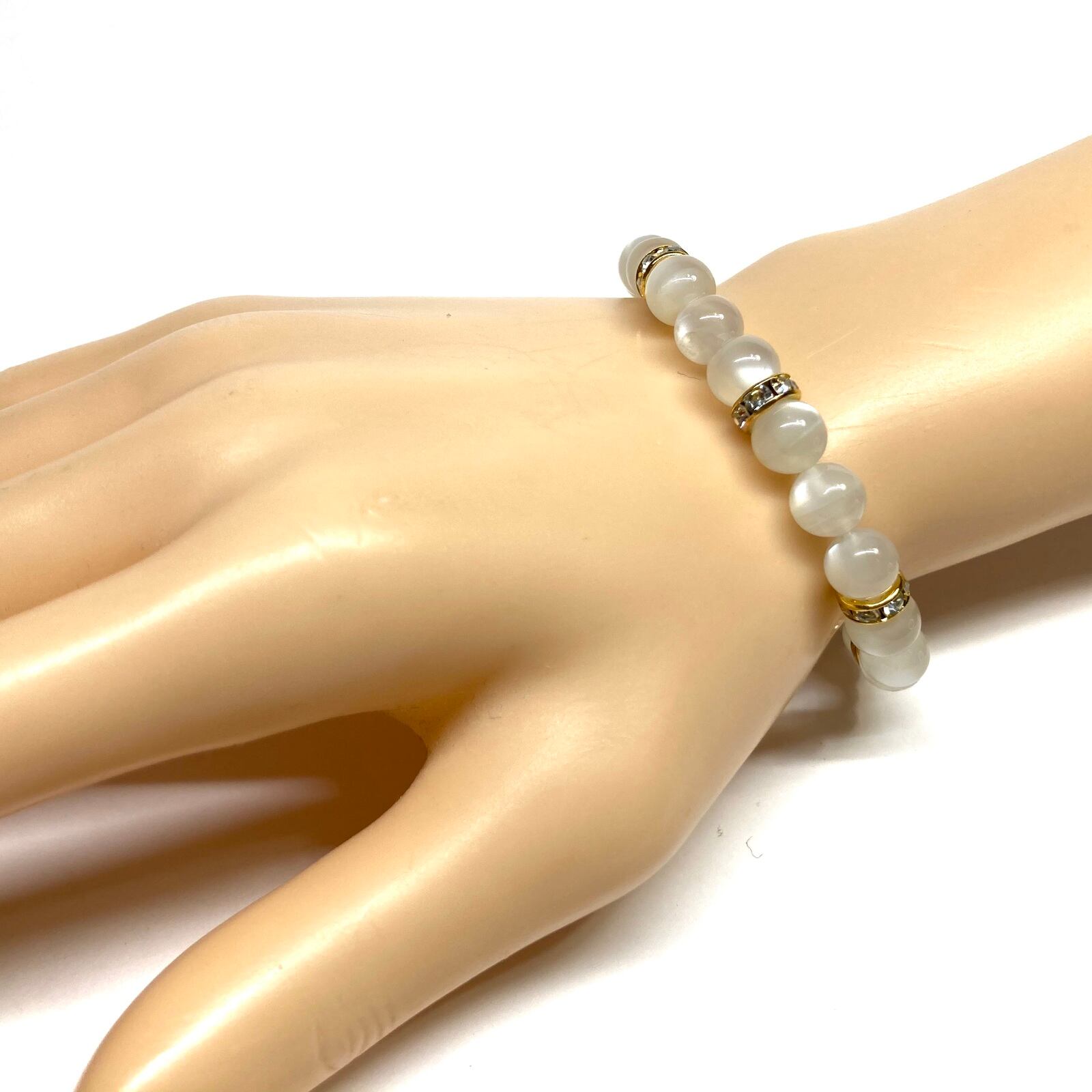 こちらは、8mm玉のムーンストーンを使ったパワーストーンブレスレットです。シンプルなデザインでどんなコーディネートにも合わせやすいデザインに仕上げています。サイズは内周約15cmです。気になる方は是非この機会にどうぞ。