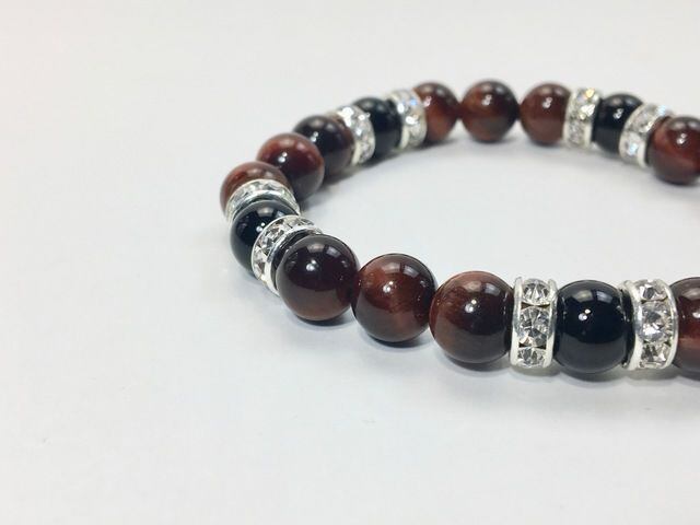 こちらは、8mm玉のレッドタイガーアイとオニキスを使ったパワーストーンブレスレットです。シンプルなデザインでどんなコーディネートにも合わせやすいデザインに仕上げています。サイズは内周約15cmです。気になる方は是非この機会にどうぞ。