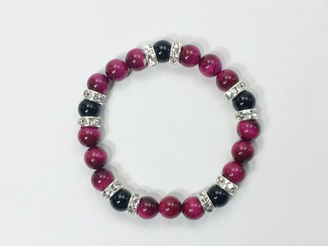 こちらは、8mm玉のピンクタイガーアイとオニキスを使ったパワーストーンブレスレットです。シンプルなデザインでどんなコーディネートにも合わせやすいデザインに仕上げています。サイズは内周約15cmです。気になる方は是非この機会にどうぞ。