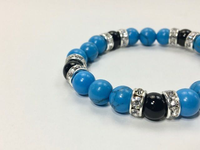こちらは、8mm玉のターコイズとオニキスを使ったパワーストーンブレスレットです。シンプルなデザインでどんなコーディネートにも合わせやすいデザインに仕上げています。サイズは内周約15cmです。気になる方は是非この機会にどうぞ。