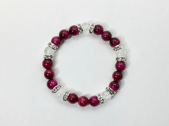 こちらは、8mm玉のピンクタイガーアイとクラック水晶を使ったパワーストーンブレスレットです。シンプルなデザインでどんなコーディネートにも合わせやすいデザインに仕上げています。サイズは内周約15cmです。気になる方は是非この機会にどうぞ。