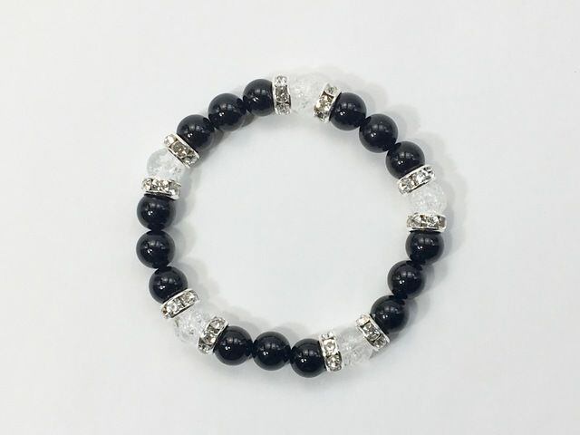 こちらは、8mm玉のオニキスとクラック水晶を使ったパワーストーンブレスレットです。シンプルなデザインでどんなコーディネートにも合わせやすいデザインに仕上げています。サイズは内周約15cmです。気になる方は是非この機会にどうぞ。