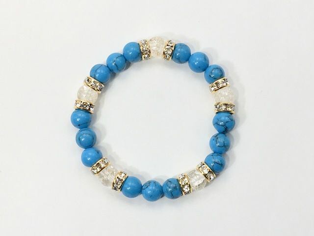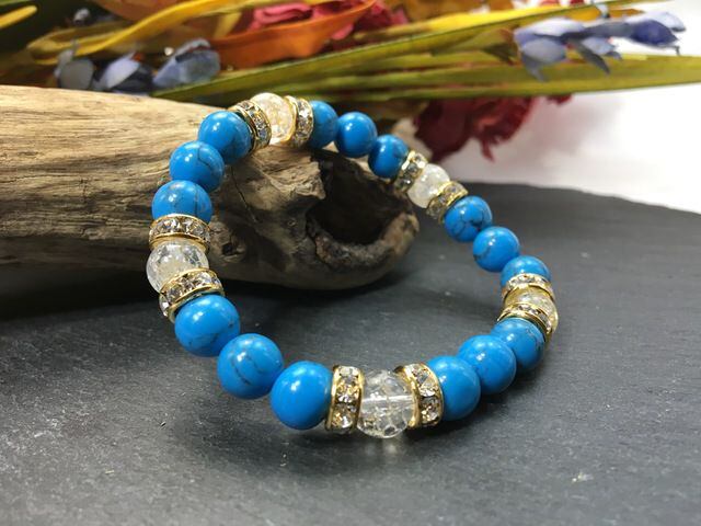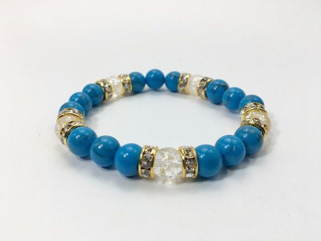 こちらは、8mm玉のターコイズとクラック水晶を使ったパワーストーンブレスレットです。シンプルなデザインでどんなコーディネートにも合わせやすいデザインに仕上げています。サイズは内周約15cmです。気になる方は是非この機会にどうぞ。