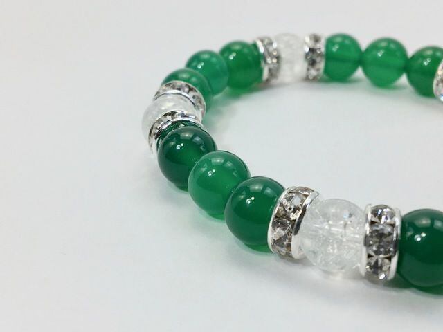 こちらは、8mm玉の緑瑪瑙とクラック水晶を使ったパワーストーンブレスレットです。シンプルなデザインでどんなコーディネートにも合わせやすいデザインに仕上げています。サイズは内周約15cmです。気になる方は是非この機会にどうぞ。