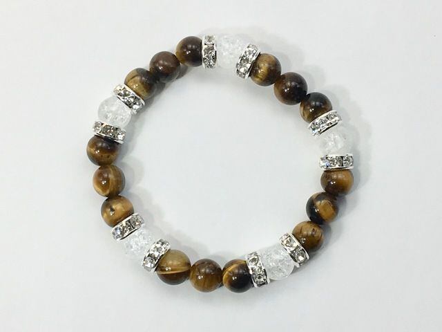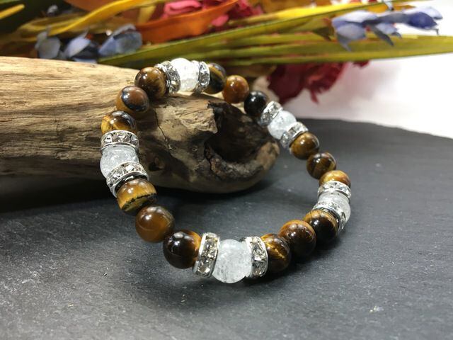 こちらは、8mm玉のタイガーアイとクラック水晶を使ったパワーストーンブレスレットです。シンプルなデザインでどんなコーディネートにも合わせやすいデザインに仕上げています。サイズは内周約15cmです。気になる方は是非この機会にどうぞ。