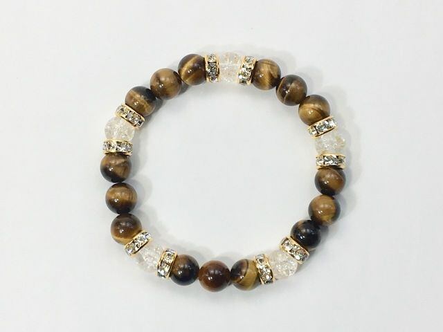 こちらは、8mm玉のタイガーアイとクラック水晶を使ったパワーストーンブレスレットです。シンプルなデザインでどんなコーディネートにも合わせやすいデザインに仕上げています。サイズは内周約15cmです。気になる方は是非この機会にどうぞ。