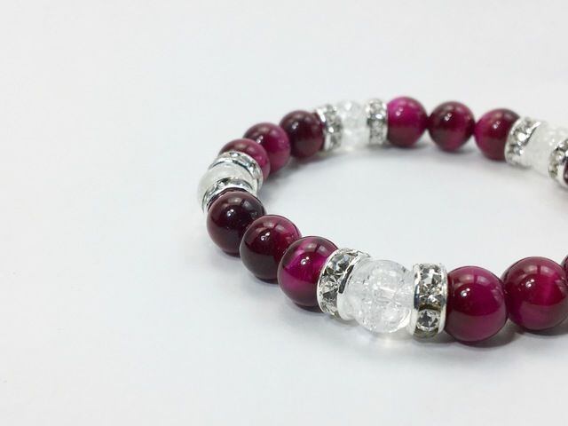 こちらは、8mm玉のピンクタイガーアイとクラック水晶を使ったパワーストーンブレスレットです。シンプルなデザインでどんなコーディネートにも合わせやすいデザインに仕上げています。サイズは内周約15cmです。気になる方は是非この機会にどうぞ。