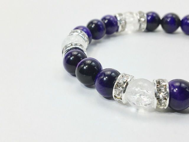こちらは、8mm玉のパープルタイガーアイとクラック水晶を使ったパワーストーンブレスレットです。シンプルなデザインでどんなコーディネートにも合わせやすいデザインに仕上げています。サイズは内周約15cmです。気になる方は是非この機会にどうぞ。