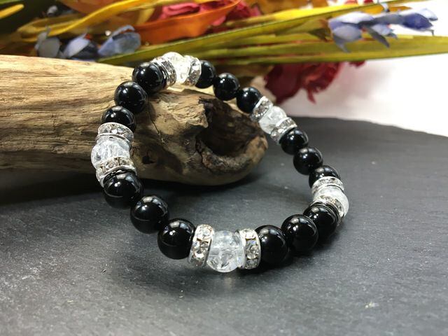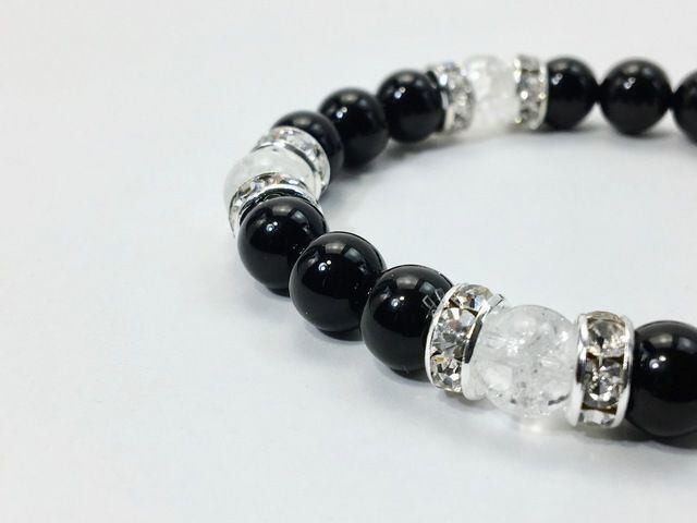 こちらは、8mm玉のオニキスとクラック水晶を使ったパワーストーンブレスレットです。シンプルなデザインでどんなコーディネートにも合わせやすいデザインに仕上げています。サイズは内周約15cmです。気になる方は是非この機会にどうぞ。