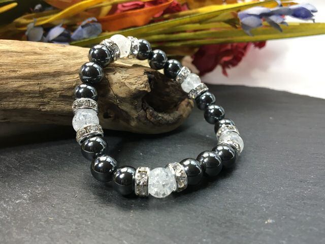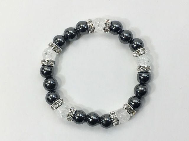こちらは、8mm玉のヘマタイトとクラック水晶を使ったパワーストーンブレスレットです。シンプルなデザインでどんなコーディネートにも合わせやすいデザインに仕上げています。サイズは内周約15cmです。気になる方は是非この機会にどうぞ。