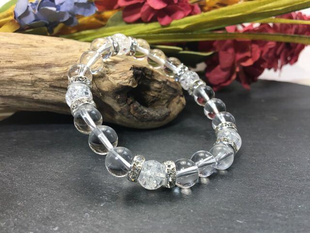 こちらは、8mm玉の水晶とクラック水晶を使ったパワーストーンブレスレットです。シンプルなデザインでどんなコーディネートにも合わせやすいデザインに仕上げています。サイズは内周約15cmです。気になる方は是非この機会にどうぞ。