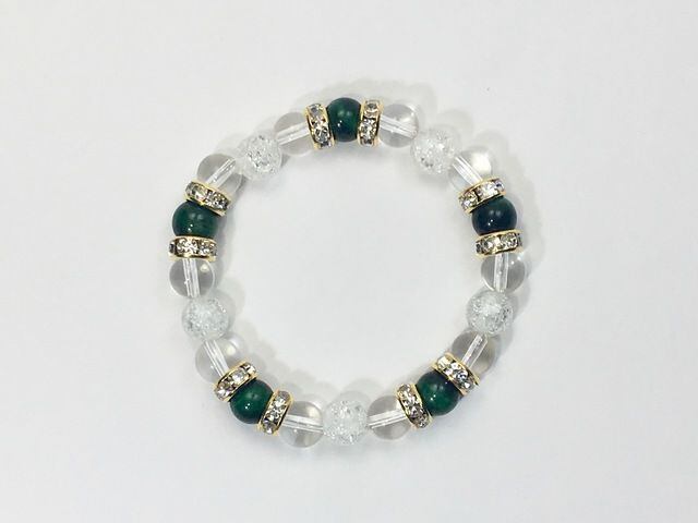 こちらは、8mm玉のグリーンタイガーアイと水晶、クラック水晶を組み合わせたパワーストーンブレスレットです。今回は五芒星デザインで石を配置しております。五芒星とは、陰陽道の基本概念となった陰陽五行説、木・火・土・金・水の5つの元素の働きの相克を表したものであり、五芒星は厄除・開運を願うデザインと重宝されているデザインです。サイズは内周約15cmです。気になる方は是非この機会にどうぞ。