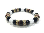 こちらは、8mm玉のレッドタイガーアイとオニキス、クラック水晶を組み合わせたパワーストーンブレスレットです。今回は五芒星デザインで石を配置しております。五芒星とは、陰陽道の基本概念となった陰陽五行説、木・火・土・金・水の5つの元素の働きの相克を表したものであり、五芒星は厄除・開運を願うデザインと重宝されているデザインです。サイズは内周約15cmです。気になる方は是非この機会にどうぞ。