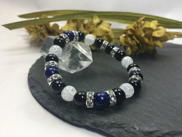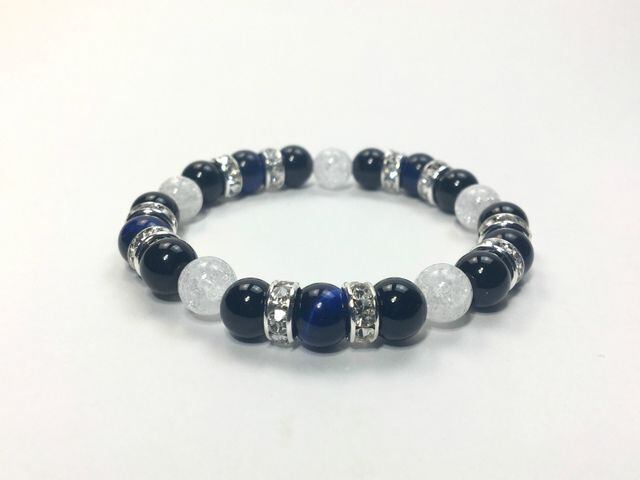 こちらは、8mm玉のブルータイガーアイとオニキス、クラック水晶を組み合わせたパワーストーンブレスレットです。今回は五芒星デザインで石を配置しております。五芒星とは、陰陽道の基本概念となった陰陽五行説、木・火・土・金・水の5つの元素の働きの相克を表したものであり、五芒星は厄除・開運を願うデザインと重宝されているデザインです。サイズは内周約15cmです。気になる方は是非この機会にどうぞ。
