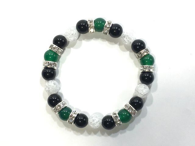 こちらは、8mm玉の緑瑪瑙とオニキス、クラック水晶を組み合わせたパワーストーンブレスレットです。今回は五芒星デザインで石を配置しております。五芒星とは、陰陽道の基本概念となった陰陽五行説、木・火・土・金・水の5つの元素の働きの相克を表したものであり、五芒星は厄除・開運を願うデザインと重宝されているデザインです。サイズは内周約15cmです。気になる方は是非この機会にどうぞ。