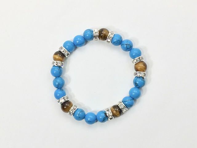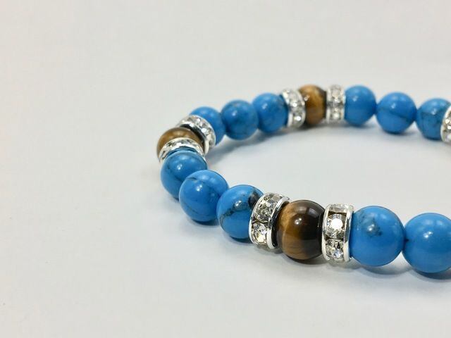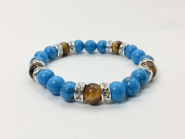こちらは、8mm玉のターコイズとタイガーアイを使ったパワーストーンブレスレットです。シンプルなデザインでどんなコーディネートにも合わせやすいデザインに仕上げています。サイズは内径約15cmです。気になる方は是非この機会にどうぞ。