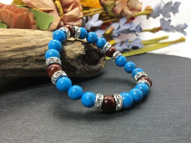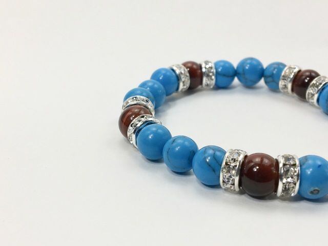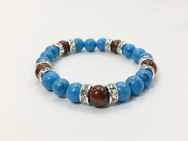 こちらは、8mm玉のターコイズとレッドタイガーアイを使ったパワーストーンブレスレットです。シンプルなデザインでどんなコーディネートにも合わせやすいデザインに仕上げています。サイズは内径約15cmです。気になる方は是非この機会にどうぞ。