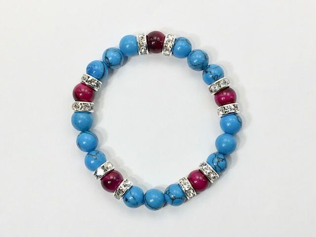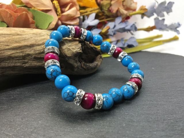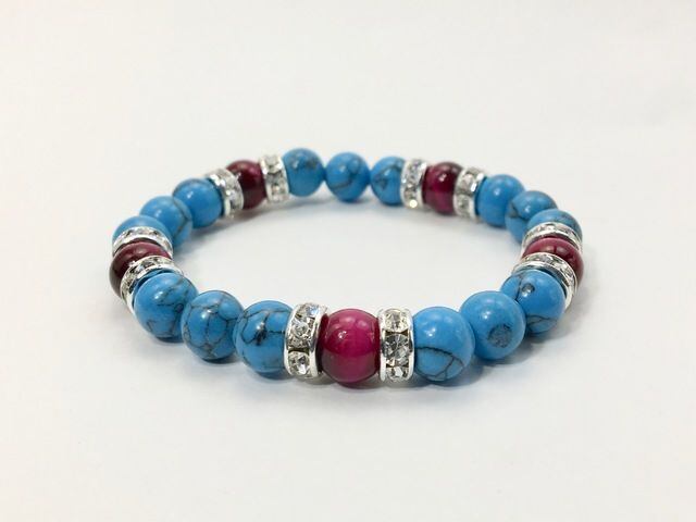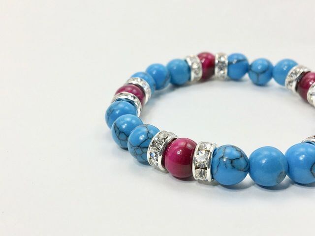 こちらは、8mm玉のターコイズとピンクタイガーアイを使ったパワーストーンブレスレットです。シンプルなデザインでどんなコーディネートにも合わせやすいデザインに仕上げています。サイズは内径約15cmです。気になる方は是非この機会にどうぞ。