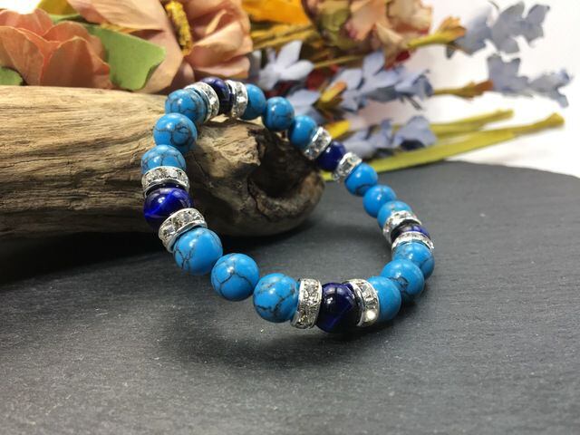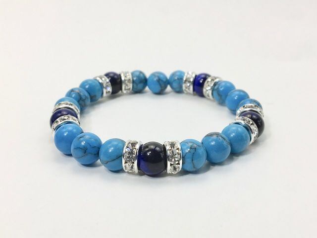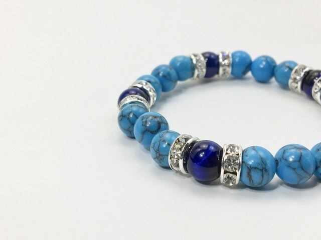 こちらは、8mm玉のターコイズとブルータイガーアイを使ったパワーストーンブレスレットです。シンプルなデザインでどんなコーディネートにも合わせやすいデザインに仕上げています。サイズは内径約15cmです。気になる方は是非この機会にどうぞ。