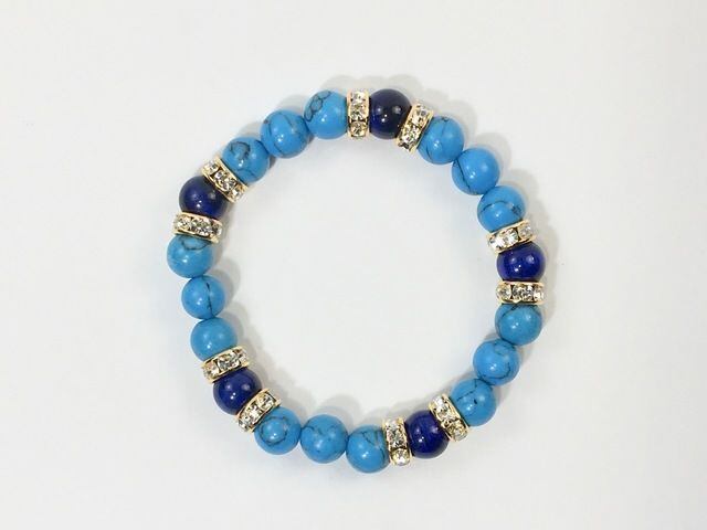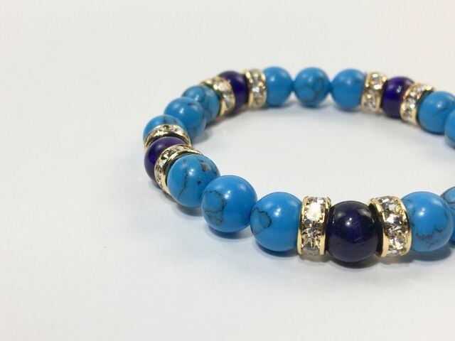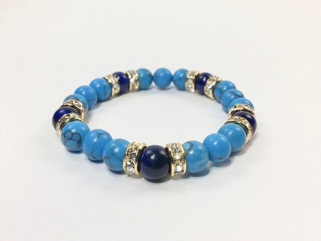 こちらは、8mm玉のターコイズとブルータイガーアイを使ったパワーストーンブレスレットです。シンプルなデザインでどんなコーディネートにも合わせやすいデザインに仕上げています。サイズは内径約15cmです。気になる方は是非この機会にどうぞ。