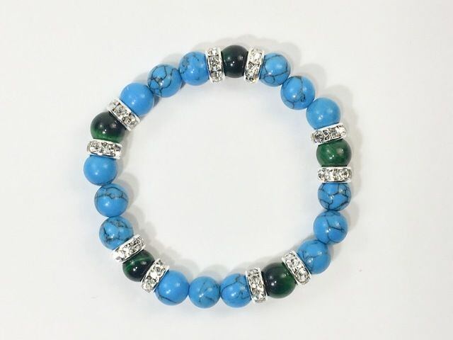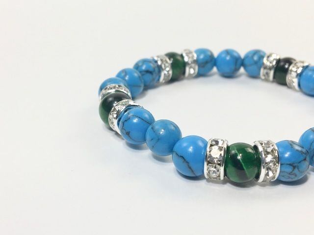 こちらは、8mm玉のターコイズとグリーンタイガーアイを使ったパワーストーンブレスレットです。シンプルなデザインでどんなコーディネートにも合わせやすいデザインに仕上げています。サイズは内径約15cmです。気になる方は是非この機会にどうぞ。